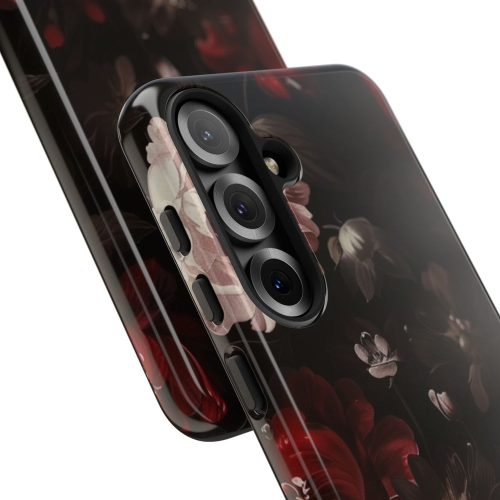 Dit hoesje heeft een naadloos patroon van grote, gedetailleerde bloemen in diepe roodtinten, donkerroze en wit op een zwarte achtergrond. De bloemen zijn uitgevoerd in een sfeervolle, klassieke stijl met verfijnde schaduwen en accenten, wat zorgt voor een rijk en dramatisch effect. Verschillende bloemsoorten, bladeren en knoppen zijn dicht op elkaar geplaatst, waardoor het hele oppervlak bedekt is. Het hoesje heeft een glanzende afwerking, een stevige polycarbonaat buitenkant en een TPU binnenlaag voor dubbele bescherming. Geschikt voor draadloos opladen.