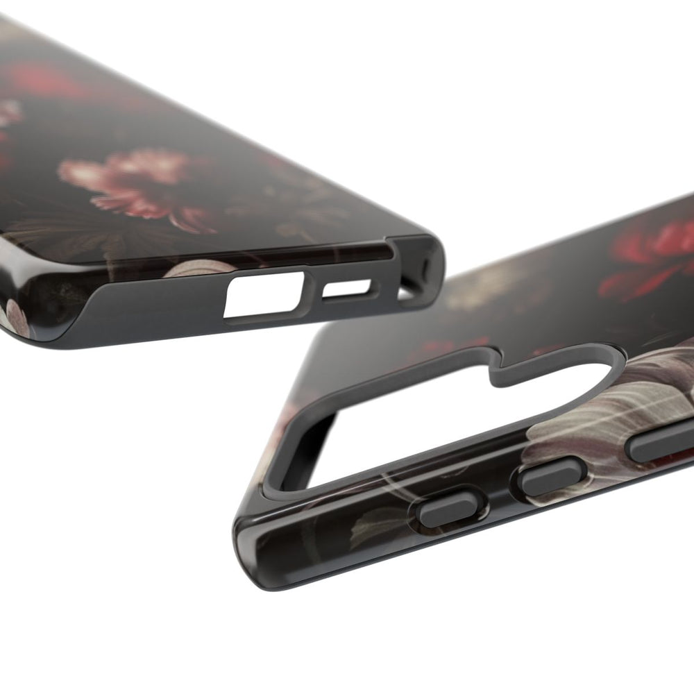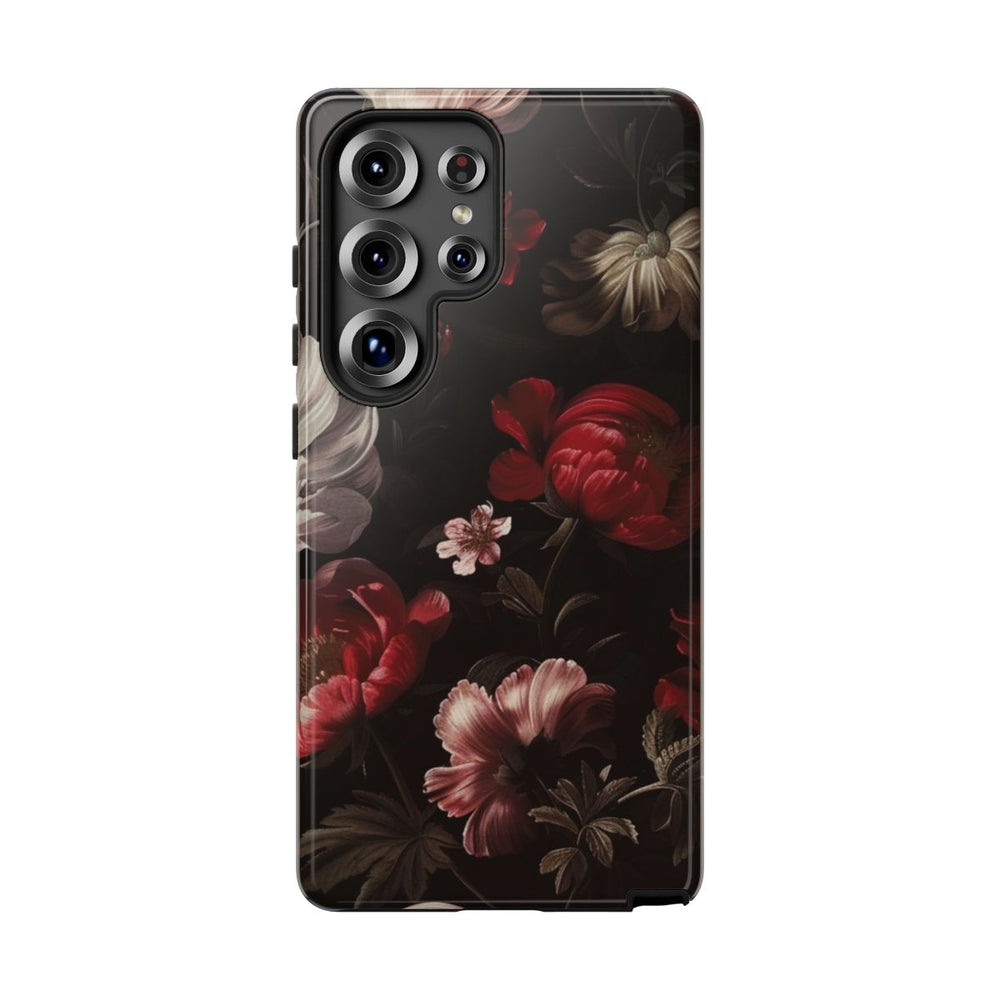 Dit hoesje heeft een naadloos patroon van donkere, sfeervolle bloemen op een zwarte achtergrond. De bloemen zijn gedetailleerd uitgewerkt in diepe roodtinten, donkerroze en wit, wat zorgt voor een rijk en opvallend contrast. Het ontwerp bevat diverse bloemen, knoppen en verfijnde bladeren in gedempte kleuren. De stijl doet denken aan klassieke schilderijen van oude meesters, wat het hoesje een tijdloze en elegante uitstraling geeft. Dit glanzende, stevige hoesje bestaat uit twee lagen voor extra bescherming en duurzaamheid. Ondersteunt draadloos opladen.