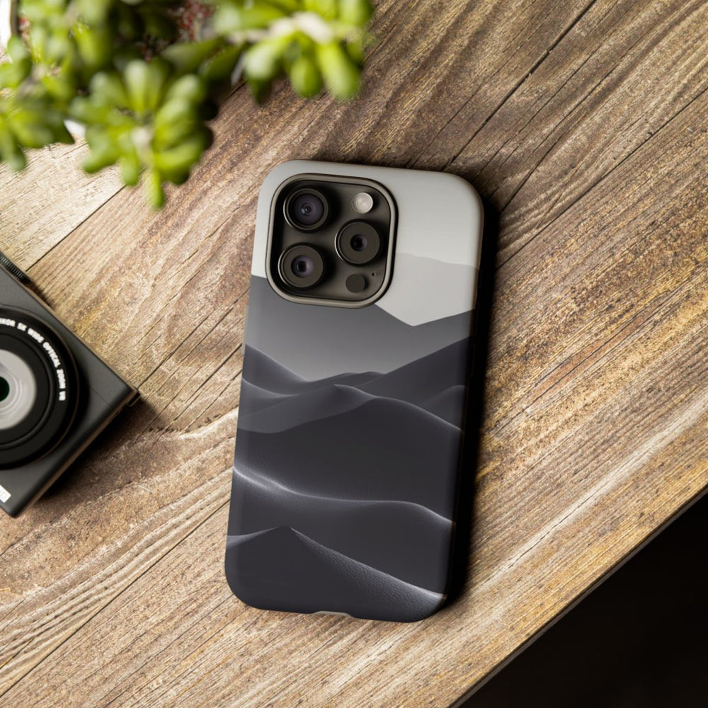 Dit hoesje heeft een stijlvol ontwerp met een reeks donkere, golvende bergen die vanuit diepzwart op de voorgrond geleidelijk overlopen in lichtere grijstinten naar de achtergrond. De bergen hebben een zachte, vloeiende structuur die doet denken aan zandduinen of golven. De bovenkant van het ontwerp toont een bijpassende lucht met een subtiel kleurverloop. Het hoesje bestaat uit twee stevige lagen voor extra bescherming en is geschikt voor draadloos opladen.