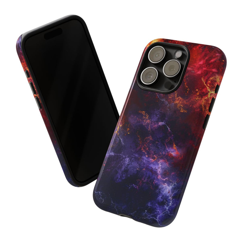 Dit hoesje heeft een opvallend ontwerp met een donkere, mysterieuze ruimtestofstructuur. Draaiende wolken in diepe rood-, paars- en blauwtinten zorgen voor een dramatisch effect. Heldere gouden aders lopen door het geheel en geven het ontwerp extra contrast en energie. De intense kleurenmix creëert een dynamische, kosmische sfeer. Het glanzende, stevige hoesje bestaat uit twee lagen voor extra stevigheid en bescherming. Geschikt voor draadloos opladen en bestand tegen verschillende weersomstandigheden.