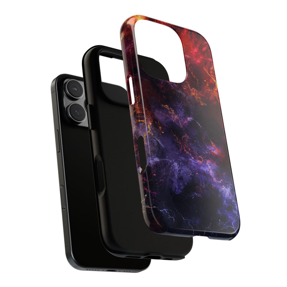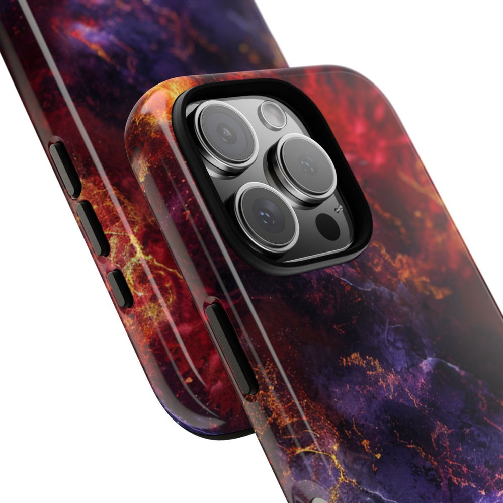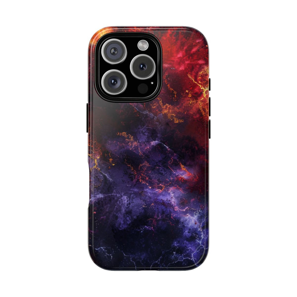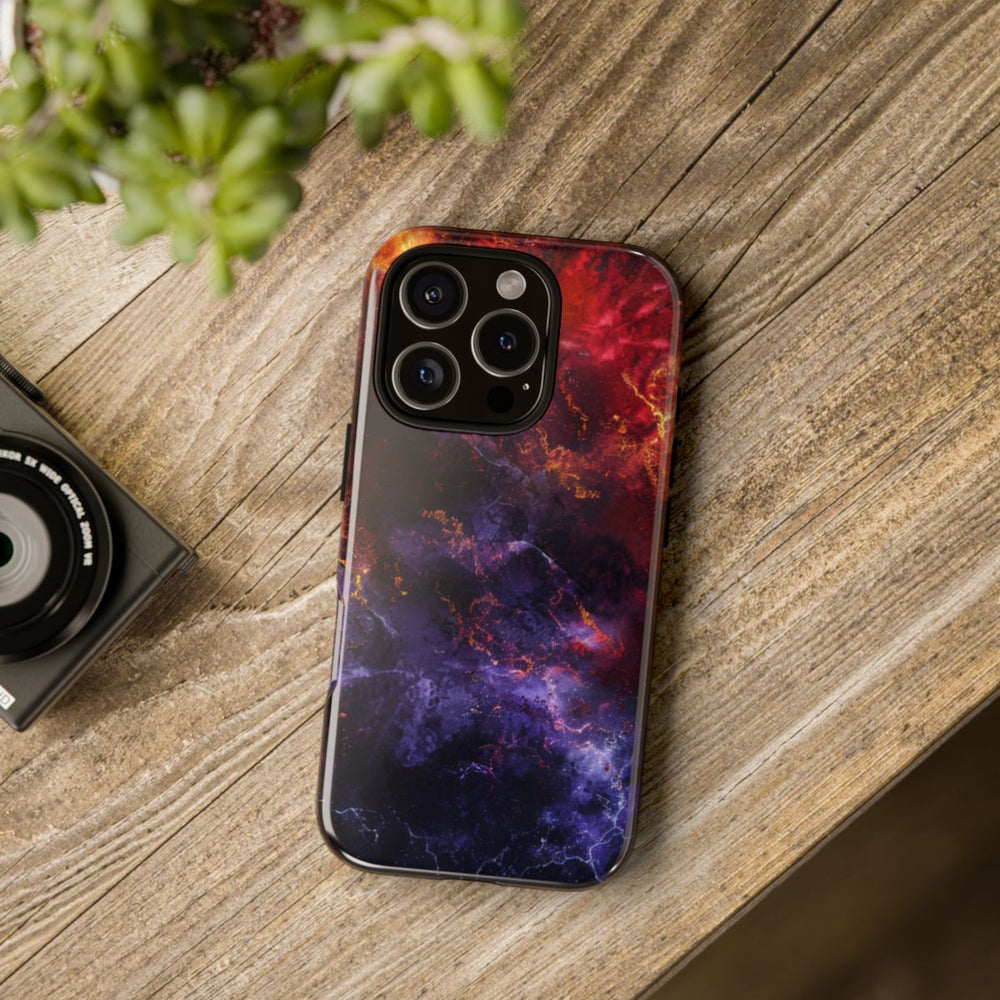 Dit hoesje heeft een opvallend ontwerp met een donkere, mysterieuze ruimtestofstructuur. Draaiende wolken in diepe rood-, paars- en blauwtinten zorgen voor een dramatisch effect. Heldere gouden aders lopen door het geheel en geven het ontwerp extra contrast en energie. De intense kleurenmix creëert een dynamische, kosmische sfeer. Het glanzende, stevige hoesje bestaat uit twee lagen voor extra stevigheid en bescherming. Geschikt voor draadloos opladen en bestand tegen verschillende weersomstandigheden.