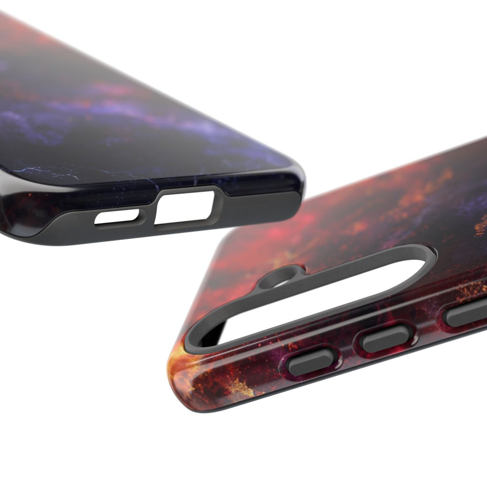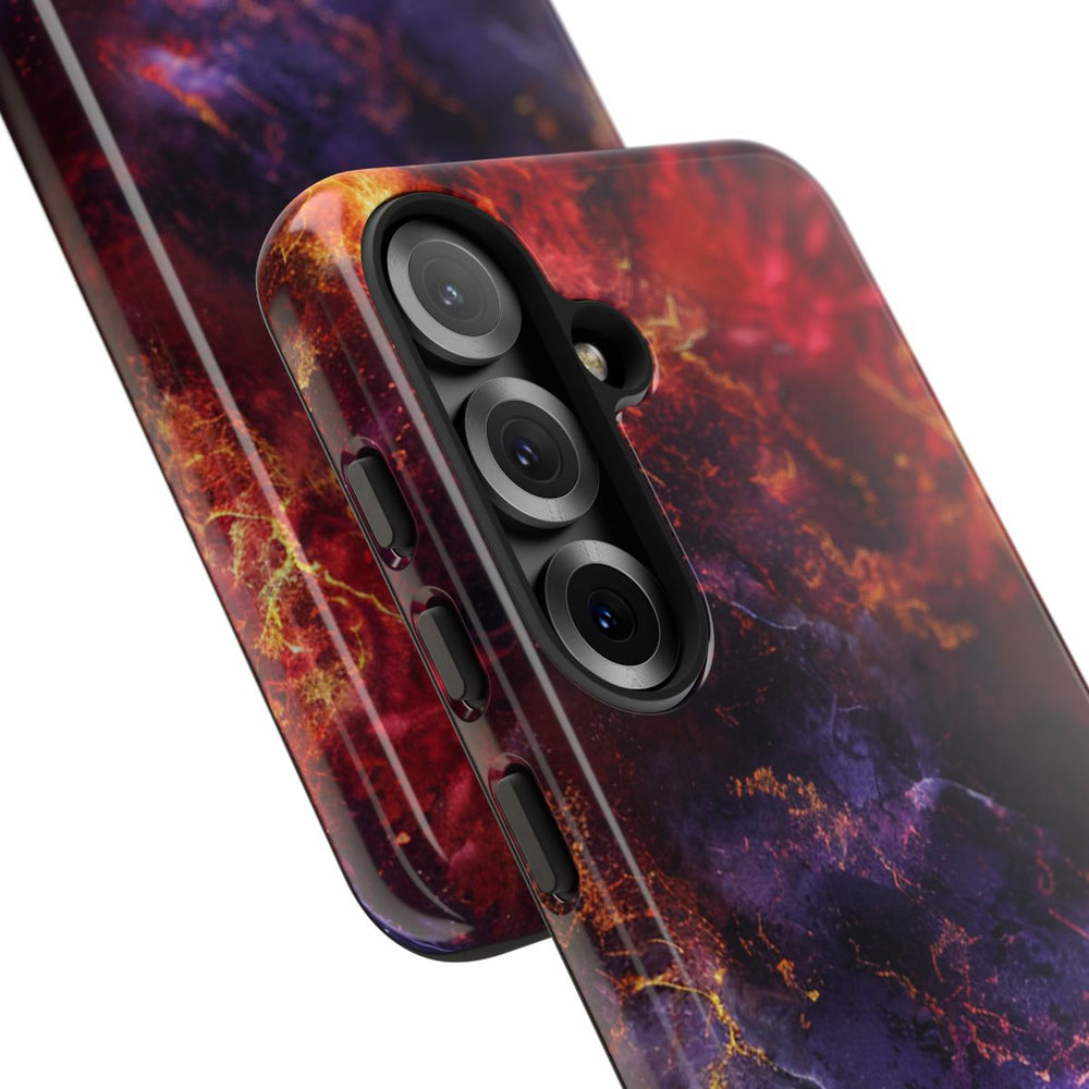 Dit hoesje heeft een opvallend ontwerp met een donkere, mysterieuze ruimtestofstructuur. Draaiende wolken in diepe rood-, paars- en blauwtinten zorgen voor een dramatisch effect. Heldere gouden aders lopen door het geheel en geven het ontwerp extra contrast en energie. De intense kleurenmix creëert een dynamische, kosmische sfeer. Het glanzende, stevige hoesje bestaat uit twee lagen voor extra stevigheid en bescherming. Geschikt voor draadloos opladen en bestand tegen verschillende weersomstandigheden.