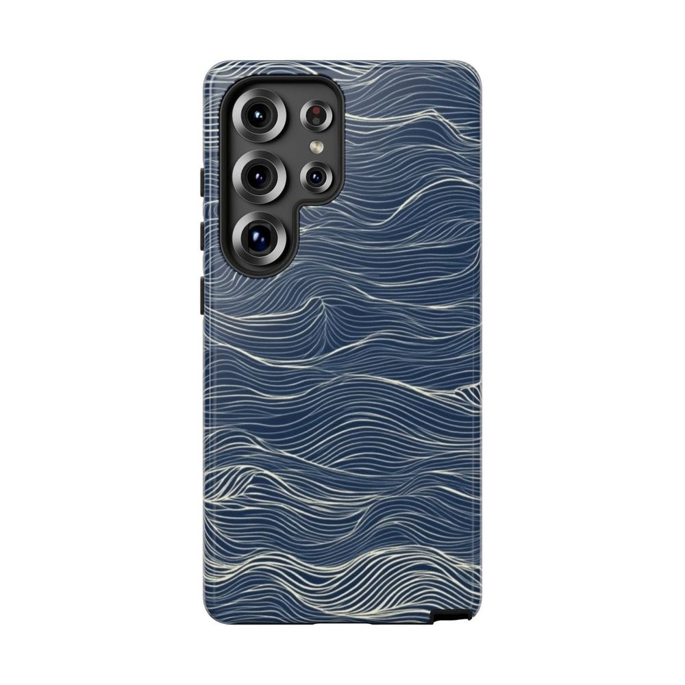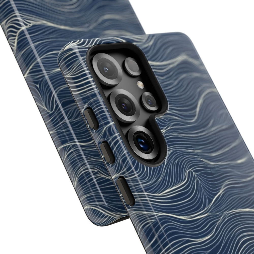 Dit hoesje heeft een naadloos patroon van vloeiende, gebogen lijnen die doen denken aan golven of rimpelingen op een donkerblauwe achtergrond. De dunne, witte lijnen zorgen voor een opvallend contrast met het diepe blauw. Het abstracte patroon loopt door en straalt beweging en dynamiek uit. Het hoesje heeft een glanzende afwerking en bestaat uit twee lagen: polycarbonaat en TPU. Dit zorgt voor extra stevigheid en bescherming. Geschikt voor draadloos opladen.