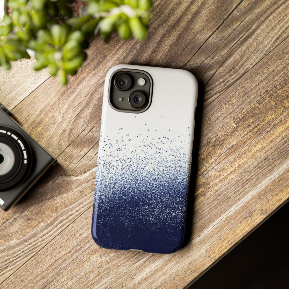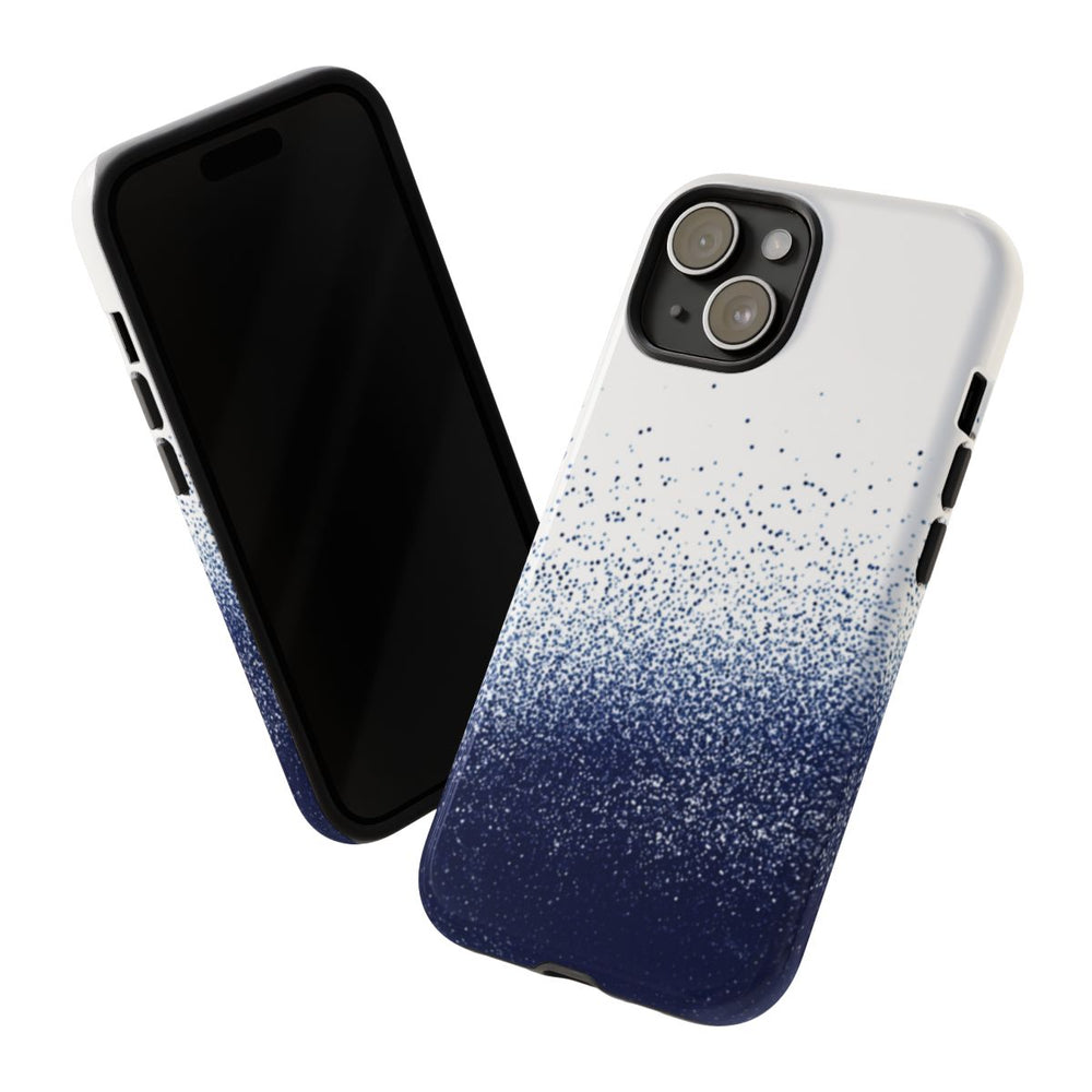Dit hoesje heeft een abstract patroon in pointillisme-stijl, met talloze kleine donkerblauwe stippen die onderaan dicht op elkaar staan en naar boven toe geleidelijk uitwaaieren op een witte achtergrond. De stippen zorgen voor een korrelig, getextureerd verloop van diep donkerblauw naar lichtere tinten, wat een gevoel van diepte en beweging geeft. Het glanzende, stevige hoesje bestaat uit een dubbele laag van een polycarbonaat buitenkant en een TPU-binnenkant, wat extra stevigheid en bescherming biedt. Ondersteunt draadloos opladen, maar is niet geschikt voor MagSafe.