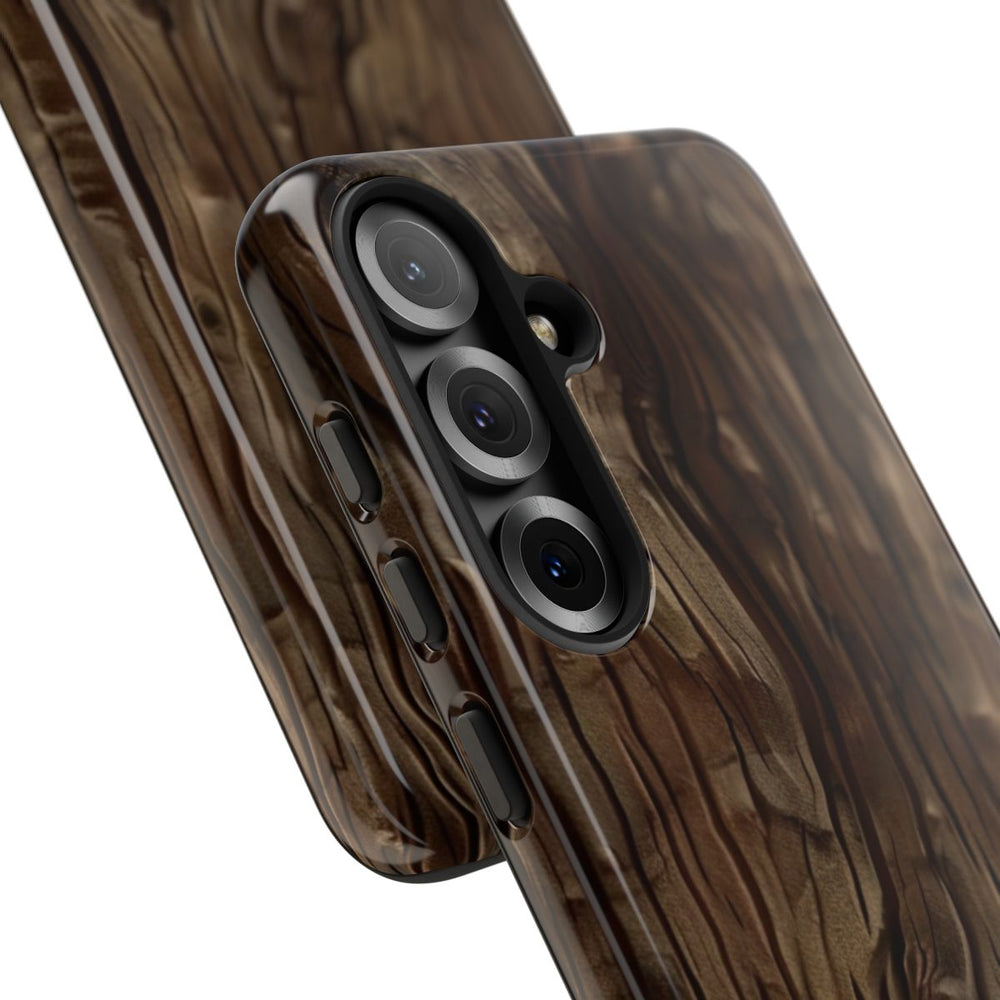 Dit hoesje heeft een gedetailleerde afbeelding van donkerbruin hout met verfijnde nerfpatronen en natuurlijke noesten. Het houtoppervlak toont diepe, rijke tinten en een tastbare uitstraling met duidelijk zichtbare lijnen en groeven. De afbeelding is aangebracht op een glanzend, stevig hoesje van een dubbele laag polycarbonaat en TPU, wat zorgt voor extra stevigheid en bescherming. Het hoesje ondersteunt draadloos opladen en is bestand tegen weersinvloeden, zodat de opdruk langdurig mooi blijft.