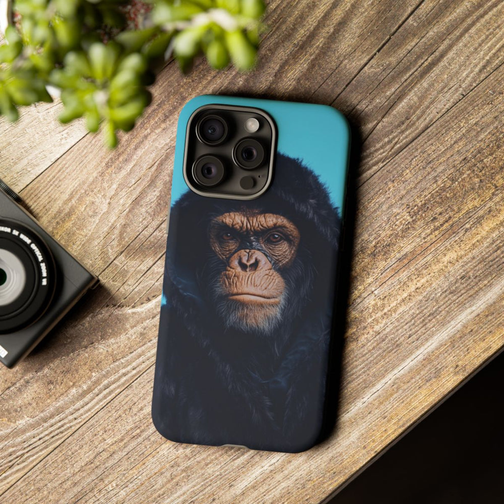 Dit ontwerp toont een opvallend portret van een aap met een serieuze uitdrukking, gehuld in een donkere, bontachtige capuchon. De heldere koningsblauwe achtergrond zorgt voor een krachtig contrast met het onderwerp. Het hoesje is voorzien van een stevige dubbele laag voor extra bescherming en ondersteunt draadloos opladen, waardoor het zeer praktisch is voor dagelijks gebruik. Het geheel heeft een gedurfde en in het oog springende uitstraling, ideaal voor wie houdt van een uniek design.