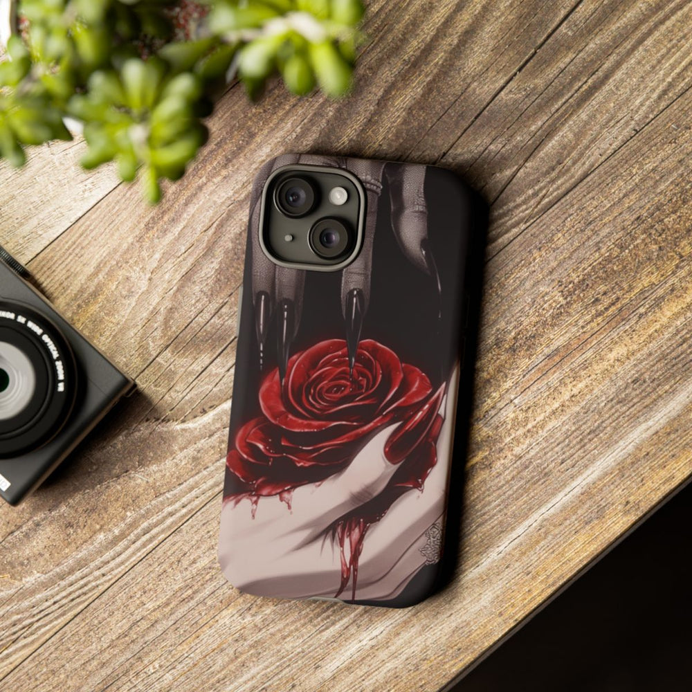 Dit ontwerp toont twee handen met lange, scherpe nagels. De ene hand is licht van kleur met rode nagels en een gedetailleerde ring, en houdt een opvallend rode roos vast. De andere hand is donkerder, versierd met ringen en lange zwarte nagels, en reikt naar de roos. De zwarte achtergrond versterkt het contrast en zorgt voor een dramatisch effect. Het hoesje is gemaakt van polycarbonaat en TPU en biedt dubbele bescherming. Ook geschikt voor draadloos opladen.