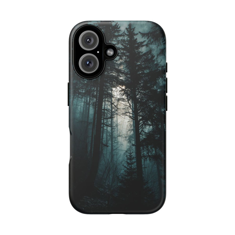 Dit hoesje toont hoge, donkere dennenbomen als silhouetten tegen een achtergrond van een mistig, nevelig bos. Het tafereel is gehuld in diepe schaduwen, terwijl een vaag, mysterieus licht door de dichte takken schijnt. De sfeer is mysterieus en sfeervol, met koele blauwe en grijze tinten die het ontwerp bepalen. Het hoesje bestaat uit twee lagen van polycarbonaat en TPU voor extra stevigheid en bescherming buitenshuis, en ondersteunt draadloos opladen.