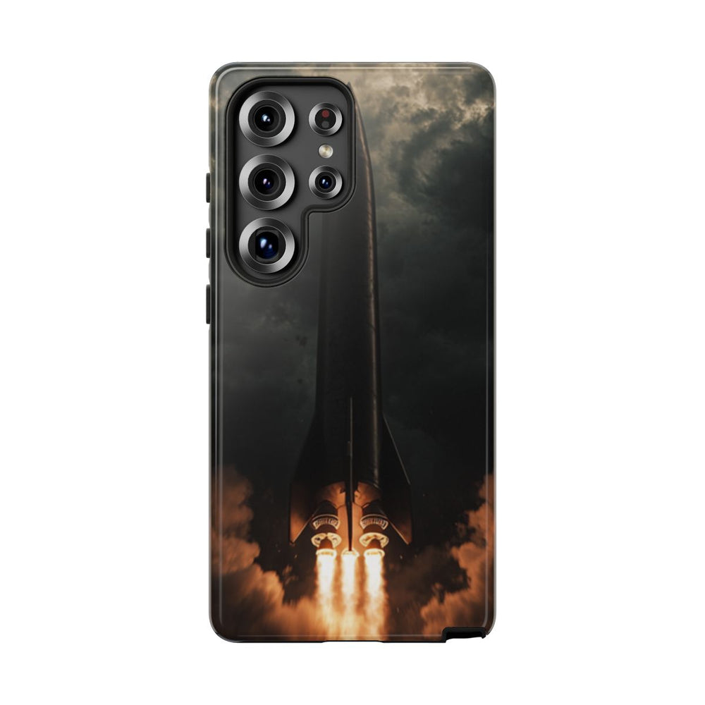 Deze afbeelding toont een raket die omhoog schiet door een donkere, bewolkte lucht. De raket is zwart en gestroomlijnd, met drie motoren aan de onderzijde die heldere oranje vlammen en rook uitstoten. De omliggende wolken zijn dicht en indrukwekkend, subtiel verlicht door het vuur van de motoren. De foto is genomen vanuit een laag standpunt, waardoor de hoogte en kracht van de raket extra worden benadrukt. Dit ontwerp is bedrukt op een glanzend en stevig telefoonhoesje met een polycarbonaat buitenkant en een TPU-binnenlaag. Het hoesje biedt dubbele bescherming en is geschikt voor draadloos opladen.