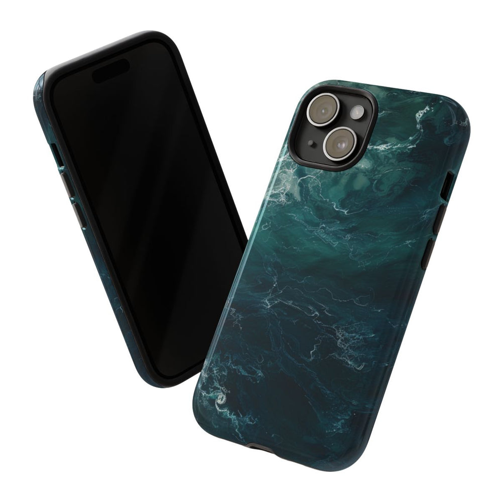 Dit ontwerp toont een bovenaanzicht van een donkere waterdiepte met kolkende, diepblauwe en zwarte tinten. Zachte overgangen en schilderachtige penseelstreken zorgen voor een sfeervolle uitstraling, met subtiele golfstructuren en fijne witte lijnen die doen denken aan lichtreflecties op het water. Het beeld roept een gevoel van diepte en mysterie op. Het hoesje heeft een glanzende afwerking en is extra stevig dankzij de dubbele laag van een polycarbonaat buitenkant en een TPU binnenkant. Geschikt voor draadloos opladen en bestand tegen verschillende weersomstandigheden.