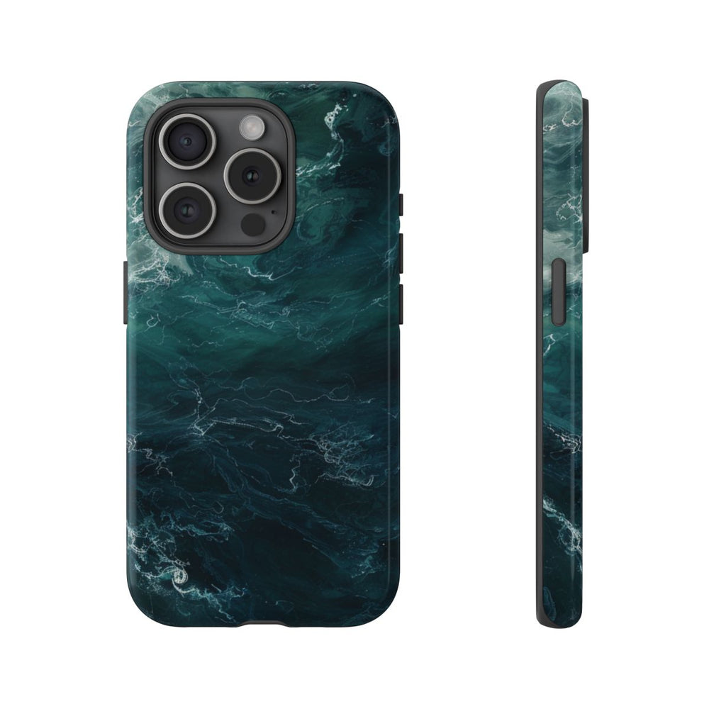Dit ontwerp toont een bovenaanzicht van een donkere waterdiepte met kolkende, diepblauwe en zwarte tinten. Zachte overgangen en schilderachtige penseelstreken zorgen voor een sfeervolle uitstraling, met subtiele golfstructuren en fijne witte lijnen die doen denken aan lichtreflecties op het water. Het beeld roept een gevoel van diepte en mysterie op. Het hoesje heeft een glanzende afwerking en is extra stevig dankzij de dubbele laag van een polycarbonaat buitenkant en een TPU binnenkant. Geschikt voor draadloos opladen en bestand tegen verschillende weersomstandigheden.