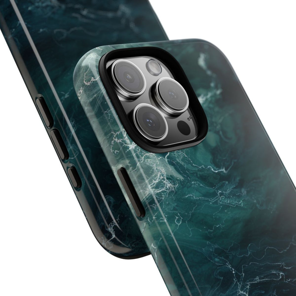 Dit ontwerp toont een bovenaanzicht van een donkere waterdiepte met kolkende, diepblauwe en zwarte tinten. Zachte overgangen en schilderachtige penseelstreken zorgen voor een sfeervolle uitstraling, met subtiele golfstructuren en fijne witte lijnen die doen denken aan lichtreflecties op het water. Het beeld roept een gevoel van diepte en mysterie op. Het hoesje heeft een glanzende afwerking en is extra stevig dankzij de dubbele laag van een polycarbonaat buitenkant en een TPU binnenkant. Geschikt voor draadloos opladen en bestand tegen verschillende weersomstandigheden.