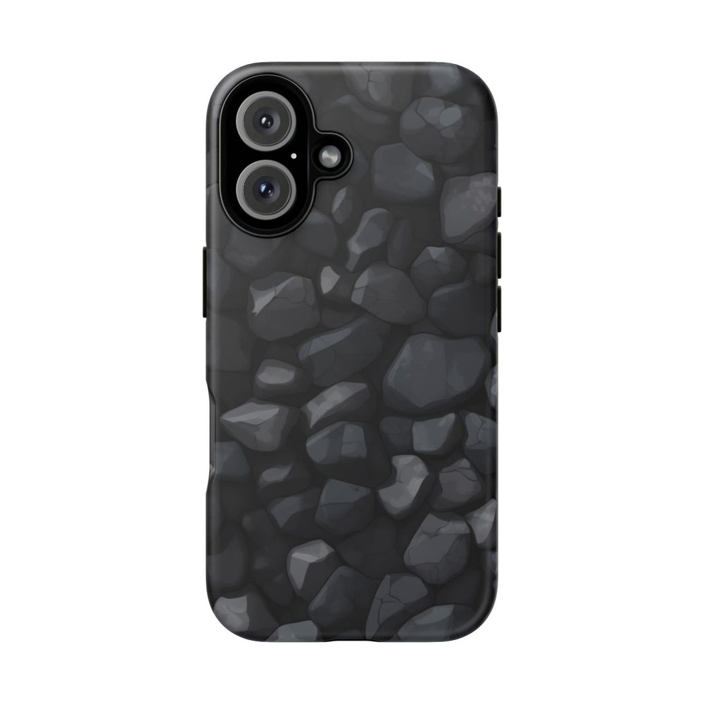 Dit telefoonhoesje heeft een naadloos patroon van donkergrijze stenen in verschillende vormen en maten. De stenen hebben een gladde, licht gebarsten structuur, wat zorgt voor een natuurlijke en minimalistische uitstraling. Het patroon is egaal en bevat geen felle plekken of lichtreflecties. Het hoesje bestaat uit een dubbele laag met een stevige polycarbonaat buitenkant en een TPU-binnenzijde, wat extra stevigheid en bescherming biedt. Het hoesje ondersteunt draadloos opladen en is bestand tegen weersinvloeden, terwijl de optische kwaliteit behouden blijft.