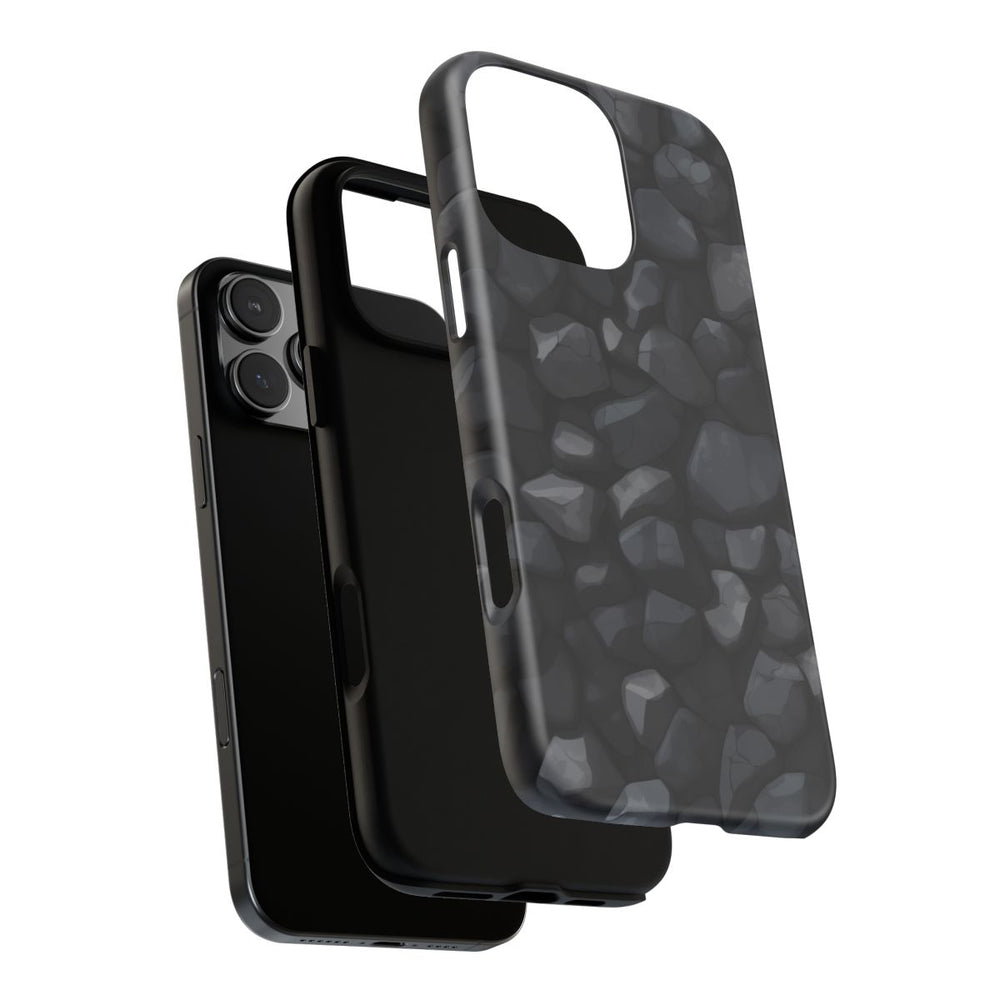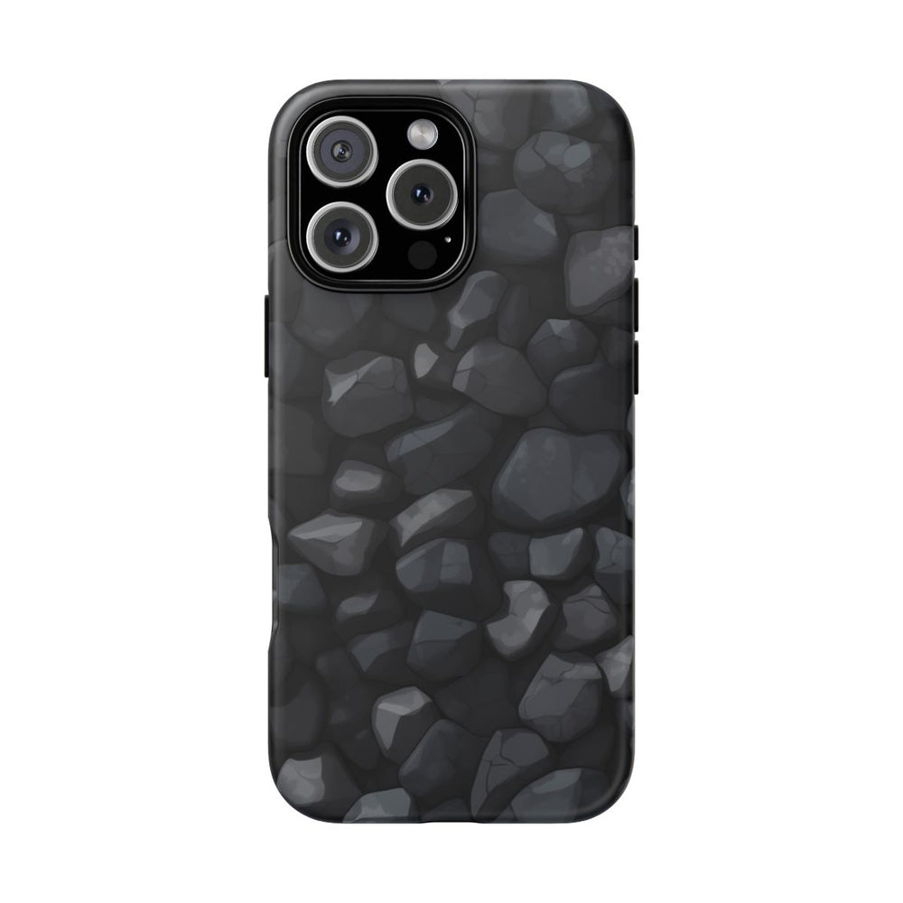 Dit telefoonhoesje heeft een naadloos patroon van donkergrijze stenen in verschillende vormen en maten. De stenen hebben een gladde, licht gebarsten structuur, wat zorgt voor een natuurlijke en minimalistische uitstraling. Het patroon is egaal en bevat geen felle plekken of lichtreflecties. Het hoesje bestaat uit een dubbele laag met een stevige polycarbonaat buitenkant en een TPU-binnenzijde, wat extra stevigheid en bescherming biedt. Het hoesje ondersteunt draadloos opladen en is bestand tegen weersinvloeden, terwijl de optische kwaliteit behouden blijft.