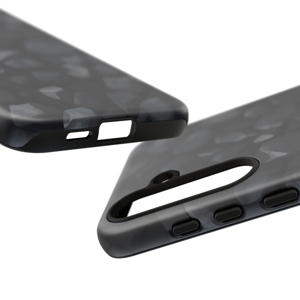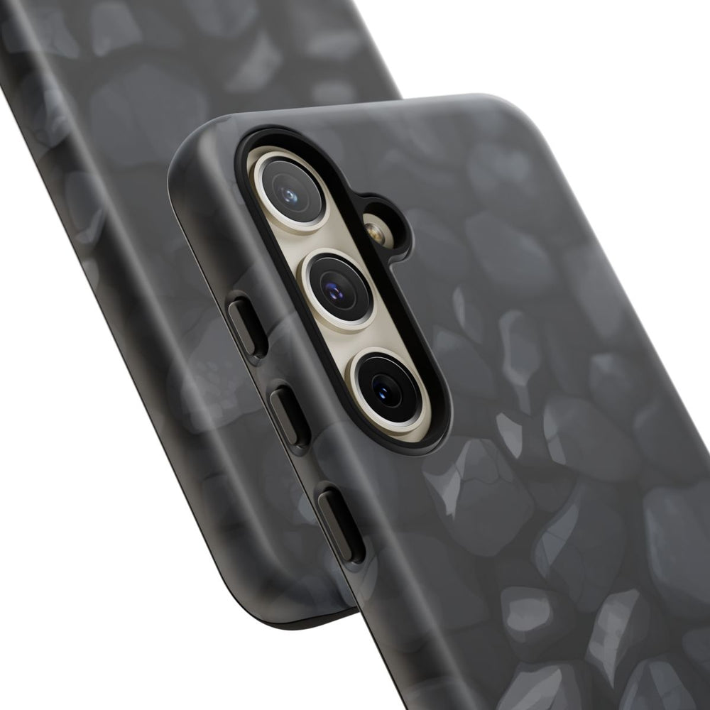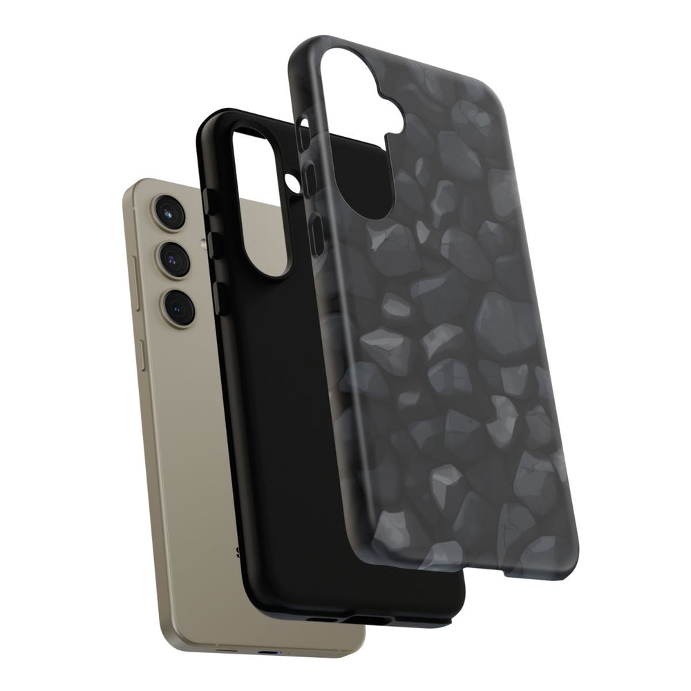 Dit telefoonhoesje heeft een naadloos patroon van donkergrijze stenen in verschillende vormen en maten. De stenen hebben een gladde, licht gebarsten structuur, wat zorgt voor een natuurlijke en minimalistische uitstraling. Het patroon is egaal en bevat geen felle plekken of lichtreflecties. Het hoesje bestaat uit een dubbele laag met een stevige polycarbonaat buitenkant en een TPU-binnenzijde, wat extra stevigheid en bescherming biedt. Het hoesje ondersteunt draadloos opladen en is bestand tegen weersinvloeden, terwijl de optische kwaliteit behouden blijft.