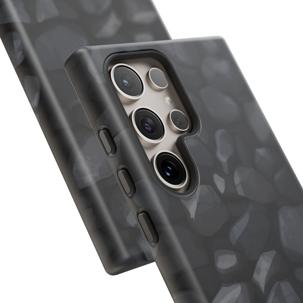 Dit telefoonhoesje heeft een naadloos patroon van donkergrijze stenen in verschillende vormen en maten. De stenen hebben een gladde, licht gebarsten structuur, wat zorgt voor een natuurlijke en minimalistische uitstraling. Het patroon is egaal en bevat geen felle plekken of lichtreflecties. Het hoesje bestaat uit een dubbele laag met een stevige polycarbonaat buitenkant en een TPU-binnenzijde, wat extra stevigheid en bescherming biedt. Het hoesje ondersteunt draadloos opladen en is bestand tegen weersinvloeden, terwijl de optische kwaliteit behouden blijft.