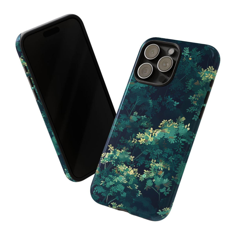 Dit hoesje heeft een dicht patroon van donkergroene bladeren in verschillende groentinten, aangevuld met kleine accenten in lichtgeel. De diepe, donkere achtergrond zorgt voor een krachtig contrast, waardoor de gedetailleerde bladeren en takken extra opvallen. Het patroon is verfijnd en gelaagd, wat een gevoel van diepte en natuurlijke complexiteit geeft. Dit glanzende, stevige hoesje is gemaakt van duurzame materialen, ondersteunt draadloos opladen en biedt optimale bescherming met een stijlvolle, door de natuur geïnspireerde uitstraling.