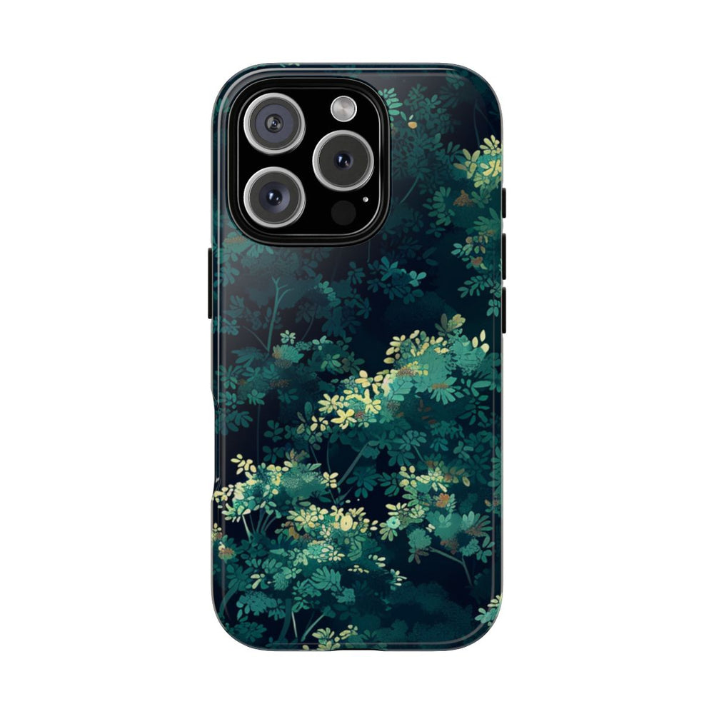 Dit hoesje heeft een dicht patroon van donkergroene bladeren in verschillende groentinten, aangevuld met kleine accenten in lichtgeel. De diepe, donkere achtergrond zorgt voor een krachtig contrast, waardoor de gedetailleerde bladeren en takken extra opvallen. Het patroon is verfijnd en gelaagd, wat een gevoel van diepte en natuurlijke complexiteit geeft. Dit glanzende, stevige hoesje is gemaakt van duurzame materialen, ondersteunt draadloos opladen en biedt optimale bescherming met een stijlvolle, door de natuur geïnspireerde uitstraling.
