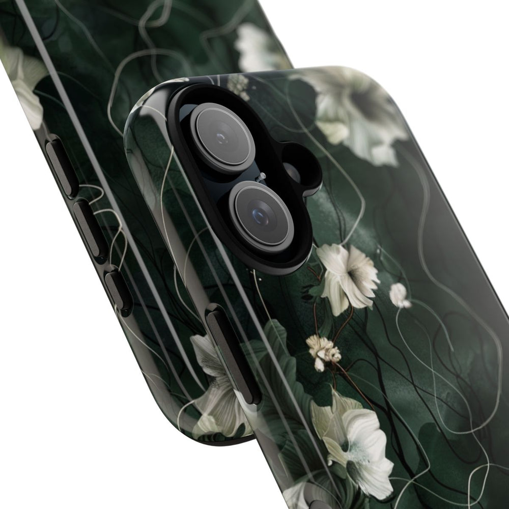 Dit hoesje heeft een donkergroene achtergrond met sierlijke ranken en grote, zachtwitte bloemen die speels over het ontwerp zijn verspreid. De bloemen hebben fijne blaadjes met subtiele schaduwen, wat zorgt voor diepte en een mooie textuur. Dunne, kronkelende lijnen lopen door het patroon en geven het geheel een elegante en verfijnde uitstraling. Het hoesje is glanzend afgewerkt en gemaakt van polycarbonaat en TPU, waardoor het bestaat uit twee beschermende lagen en geschikt is voor draadloos opladen. Het ontwerp oogt natuurlijk, artistiek en heeft een vleugje vintage.