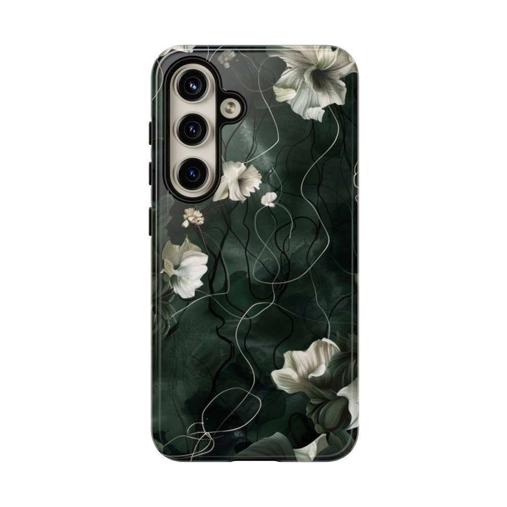 Dit hoesje heeft een donkergroene achtergrond met sierlijke ranken en grote, zachtwitte bloemen die speels over het ontwerp zijn verspreid. De bloemen hebben fijne blaadjes met subtiele schaduwen, wat zorgt voor diepte en een mooie textuur. Dunne, kronkelende lijnen lopen door het patroon en geven het geheel een elegante en verfijnde uitstraling. Het hoesje is glanzend afgewerkt en gemaakt van polycarbonaat en TPU, waardoor het bestaat uit twee beschermende lagen en geschikt is voor draadloos opladen. Het ontwerp oogt natuurlijk, artistiek en heeft een vleugje vintage.