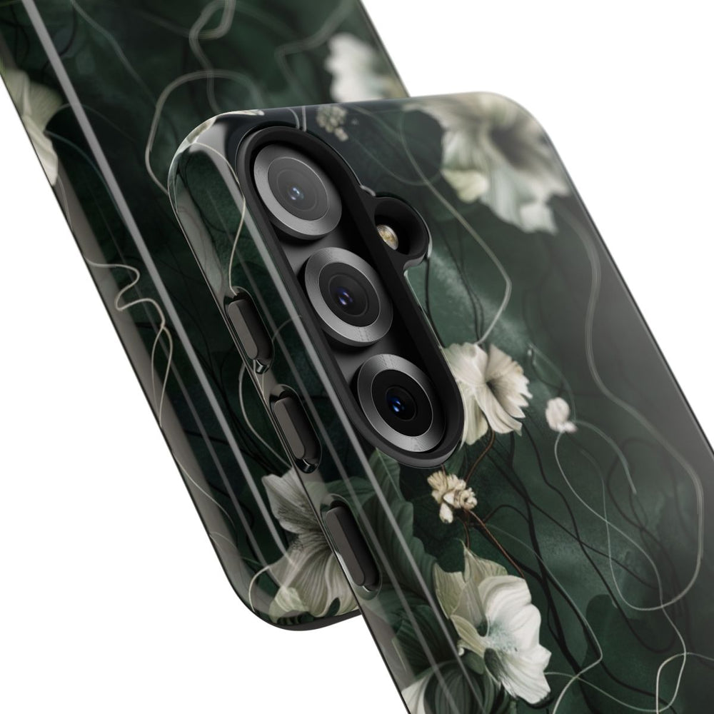 Dit hoesje heeft een donkergroene achtergrond met sierlijke ranken en grote, zachtwitte bloemen die speels over het ontwerp zijn verspreid. De bloemen hebben fijne blaadjes met subtiele schaduwen, wat zorgt voor diepte en een mooie textuur. Dunne, kronkelende lijnen lopen door het patroon en geven het geheel een elegante en verfijnde uitstraling. Het hoesje is glanzend afgewerkt en gemaakt van polycarbonaat en TPU, waardoor het bestaat uit twee beschermende lagen en geschikt is voor draadloos opladen. Het ontwerp oogt natuurlijk, artistiek en heeft een vleugje vintage.