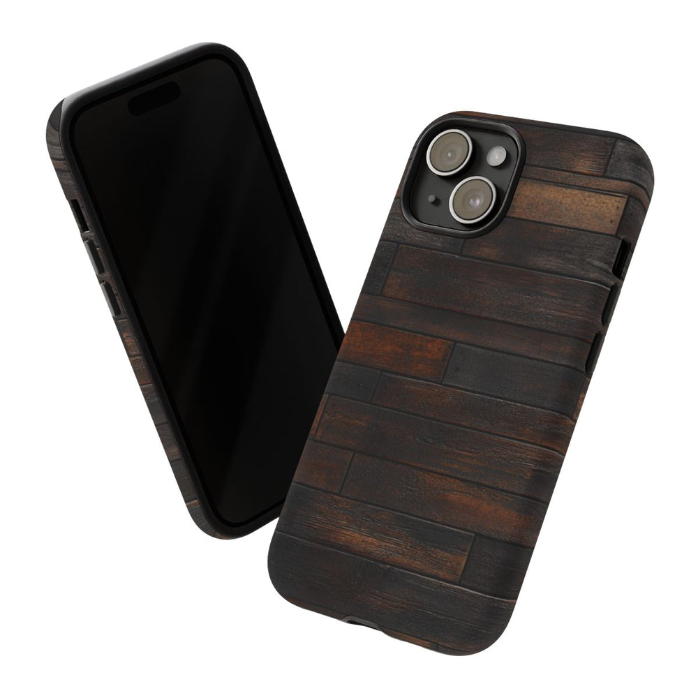 Dit hoesje heeft een ontwerp met een bovenaanzicht van donkerhouten planken die horizontaal zijn gelegd. Het hout heeft een diepe, warme bruine kleur met subtiele kleurnuances en zichtbare houtnerf en textuur. De planken ogen goed onderhouden, maar hebben een licht verweerd effect, wat zorgt voor een rustieke en sfeervolle uitstraling. De afbeelding is gedrukt op een mat telefoonhoesje met een stevige polycarbonaat buitenkant en een TPU-binnenzijde voor extra bescherming en duurzaamheid. Geschikt voor draadloos opladen.