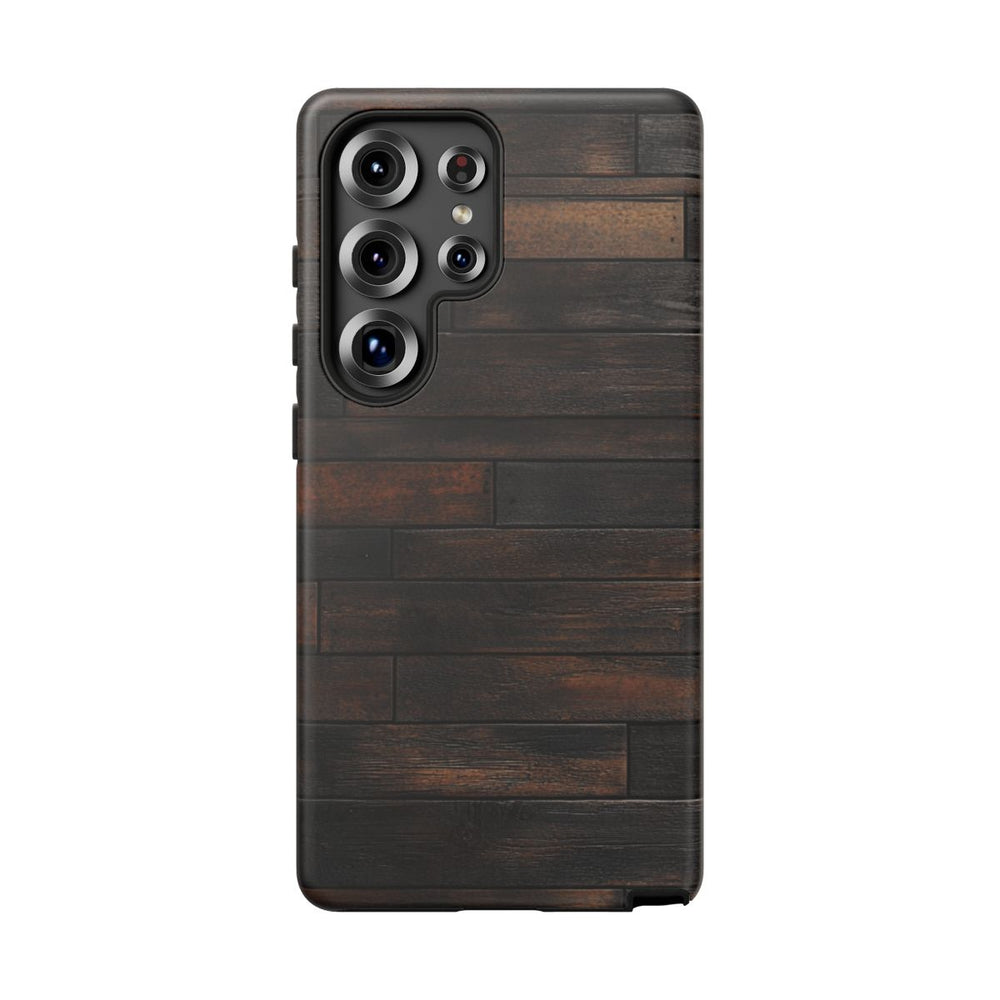 Dit hoesje heeft een ontwerp met een bovenaanzicht van donkerhouten planken die horizontaal zijn gelegd. Het hout heeft een diepe, warme bruine kleur met subtiele kleurnuances en zichtbare houtnerf en textuur. De planken ogen goed onderhouden, maar hebben een licht verweerd effect, wat zorgt voor een rustieke en sfeervolle uitstraling. De afbeelding is gedrukt op een mat telefoonhoesje met een stevige polycarbonaat buitenkant en een TPU-binnenzijde voor extra bescherming en duurzaamheid. Geschikt voor draadloos opladen.