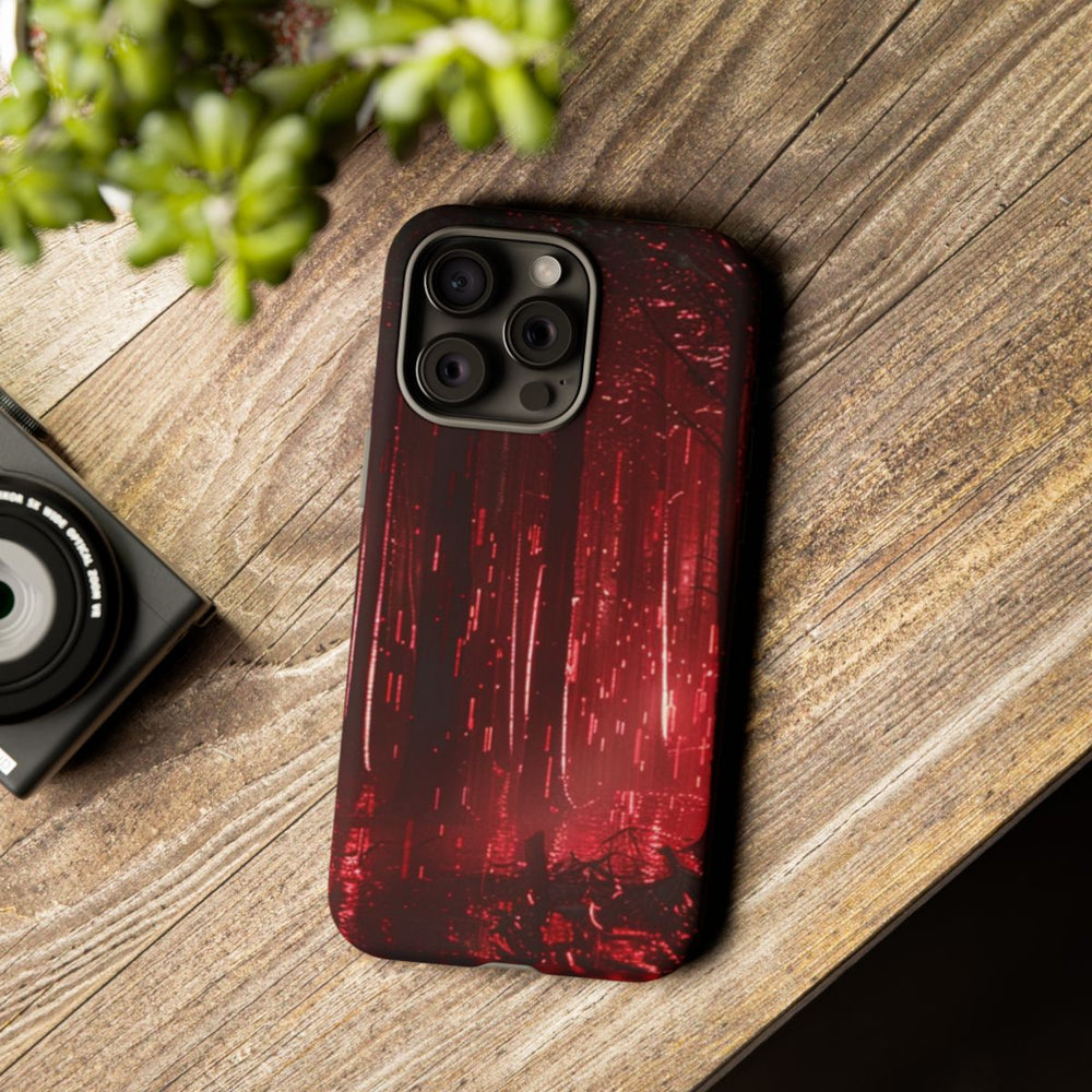 Dit hoesje heeft een ontwerp met een donker bos vol hoge, slanke bomen. Het bos is gehuld in een intens rood licht, waardoor de boomstammen en de nat of spiegelend ogende bosgrond oplichten. De mysterieuze en dramatische sfeer wordt versterkt door verticale rode lichtstrepen die het geheel een dynamisch en surrealistisch karakter geven. Het matte hoesje is gemaakt van polycarbonaat en TPU en biedt stevige bescherming met een dubbele laag. Ondersteunt draadloos opladen.