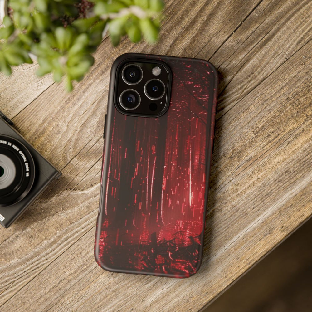 Dit hoesje heeft een ontwerp met een donker bos vol hoge, slanke bomen. Het bos is gehuld in een intens rood licht, waardoor de boomstammen en de nat of spiegelend ogende bosgrond oplichten. De mysterieuze en dramatische sfeer wordt versterkt door verticale rode lichtstrepen die het geheel een dynamisch en surrealistisch karakter geven. Het matte hoesje is gemaakt van polycarbonaat en TPU en biedt stevige bescherming met een dubbele laag. Ondersteunt draadloos opladen.