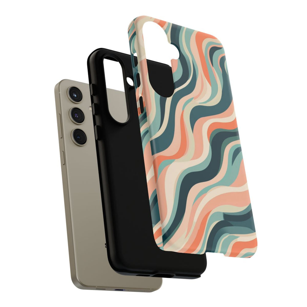Dit hoesje heeft een abstract patroon van draaiende lijnen in zachte pasteltinten zoals perzik en teal. De vloeiende vormen zorgen voor een rustgevende, retro uitstraling die doet denken aan vintage kunststijlen. Het ontwerp geeft je telefoon een stijlvolle en unieke look. Dankzij de dubbele laag biedt het hoesje extra stevigheid en bescherming. Daarnaast is het hoesje geschikt voor draadloos opladen.