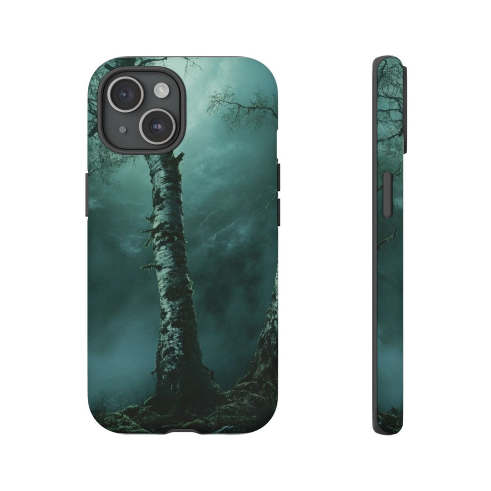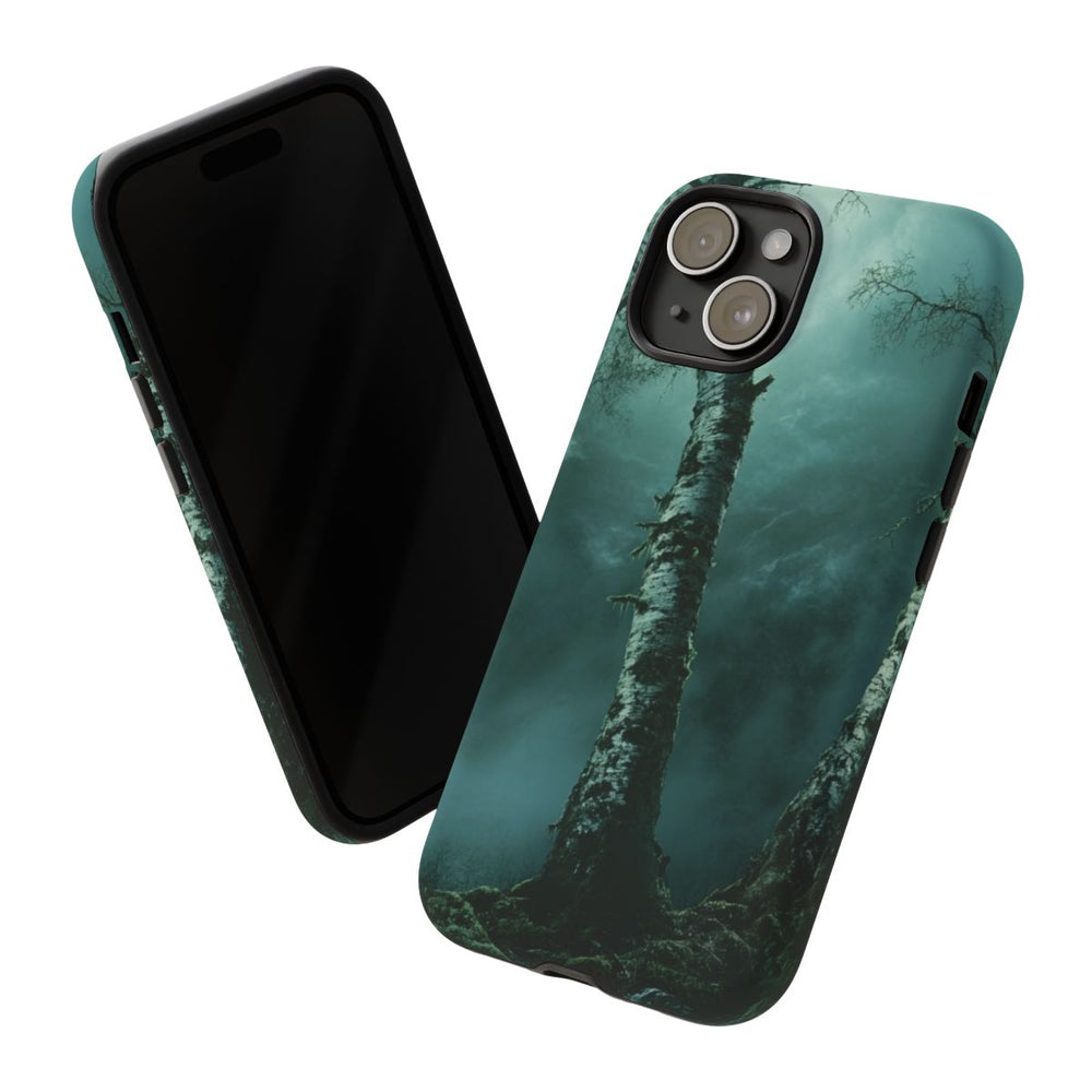 Dit hoesje heeft een sfeervol ontwerp met drie hoge berkenbomen met dikke stammen op een met mos begroeide bodem. De bomen staan in een donker bos en de bewolkte lucht zorgt voor een mysterieuze uitstraling. Het matte, stevige hoesje bestaat uit twee lagen: een buitenkant van polycarbonaat en een binnenzijde van TPU, waardoor het extra sterk is en optimale bescherming biedt. Geschikt voor draadloos opladen. Niet geschikt voor magnetisch opladen.