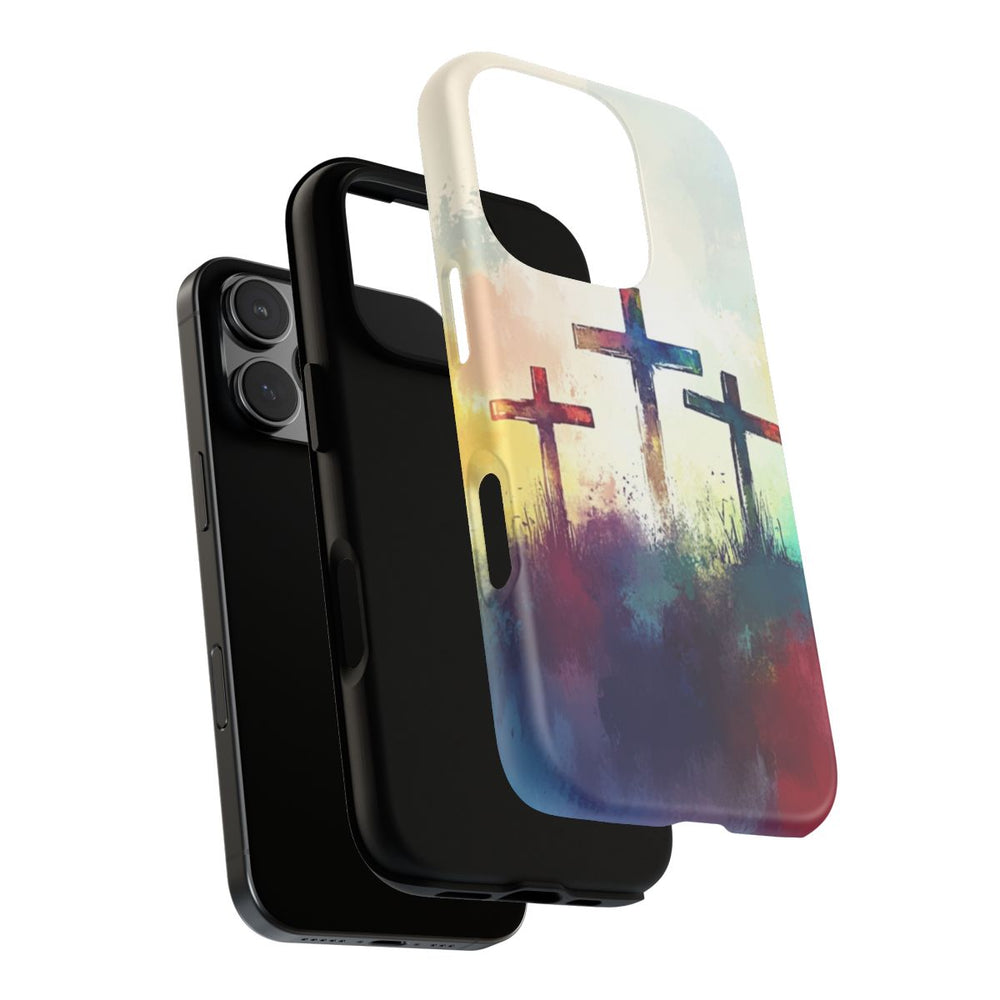Dit ontwerp toont drie kruisen op een heuvel, uitgevoerd in een abstracte waterverfstijl. De afbeelding bestaat uit zachte, in elkaar overlopende kleuren zoals blauw, rood, geel en groen, wat zorgt voor een rustige en vriendelijke uitstraling. De lichte achtergrond met pasteltinten versterkt het vredige en artistieke karakter. Het hoesje heeft een matte afwerking, bestaat uit twee lagen van polycarbonaat en TPU, en biedt stevige bescherming voor je telefoon. Daarnaast ondersteunt het draadloos opladen.