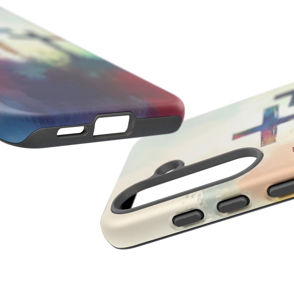 Dit ontwerp toont drie kruisen op een heuvel, uitgevoerd in een abstracte waterverfstijl. De afbeelding bestaat uit zachte, in elkaar overlopende kleuren zoals blauw, rood, geel en groen, wat zorgt voor een rustige en vriendelijke uitstraling. De lichte achtergrond met pasteltinten versterkt het vredige en artistieke karakter. Het hoesje heeft een matte afwerking, bestaat uit twee lagen van polycarbonaat en TPU, en biedt stevige bescherming voor je telefoon. Daarnaast ondersteunt het draadloos opladen.