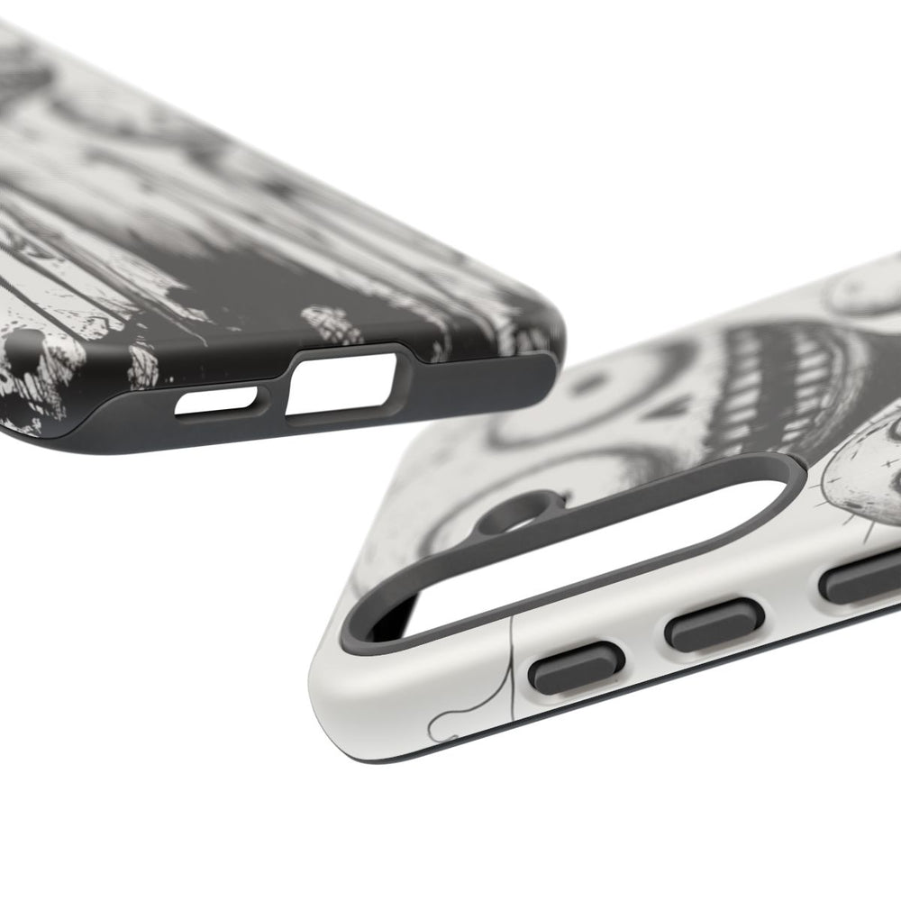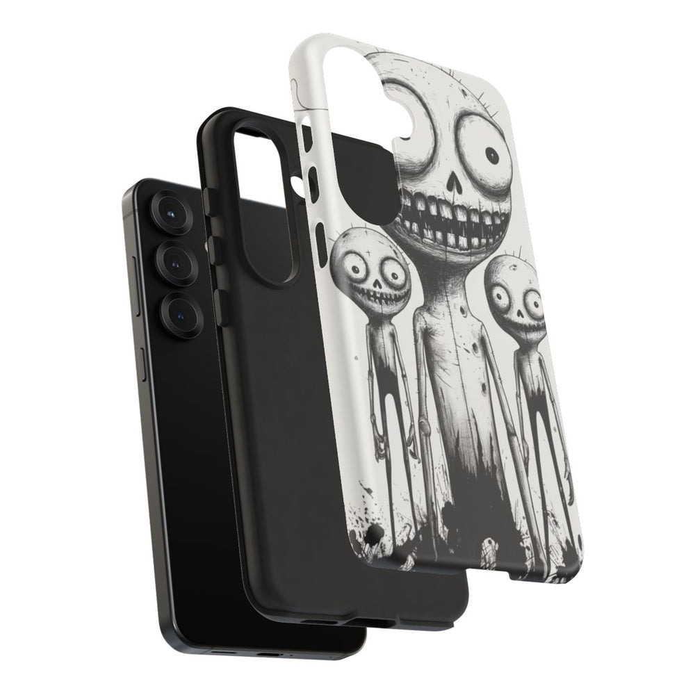 Dit hoesje is bedrukt met drie slijmerige monsters, getekend in zwart-witte lijntekening met stevige, opvallende lijnen. Elk monster heeft een groot rond hoofd met brede ogen en een brede grijns, geplaatst op een dun, langwerpig lichaam. De achtergrond is wit en aan de onderkant van de figuren zijn zwarte inktspatten te zien. Het hoesje bestaat uit twee lagen van polycarbonaat en TPU voor extra stevigheid en is geschikt voor draadloos opladen.