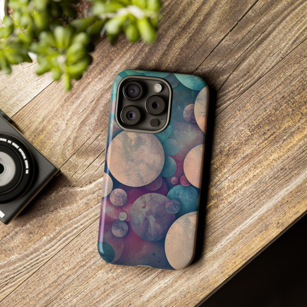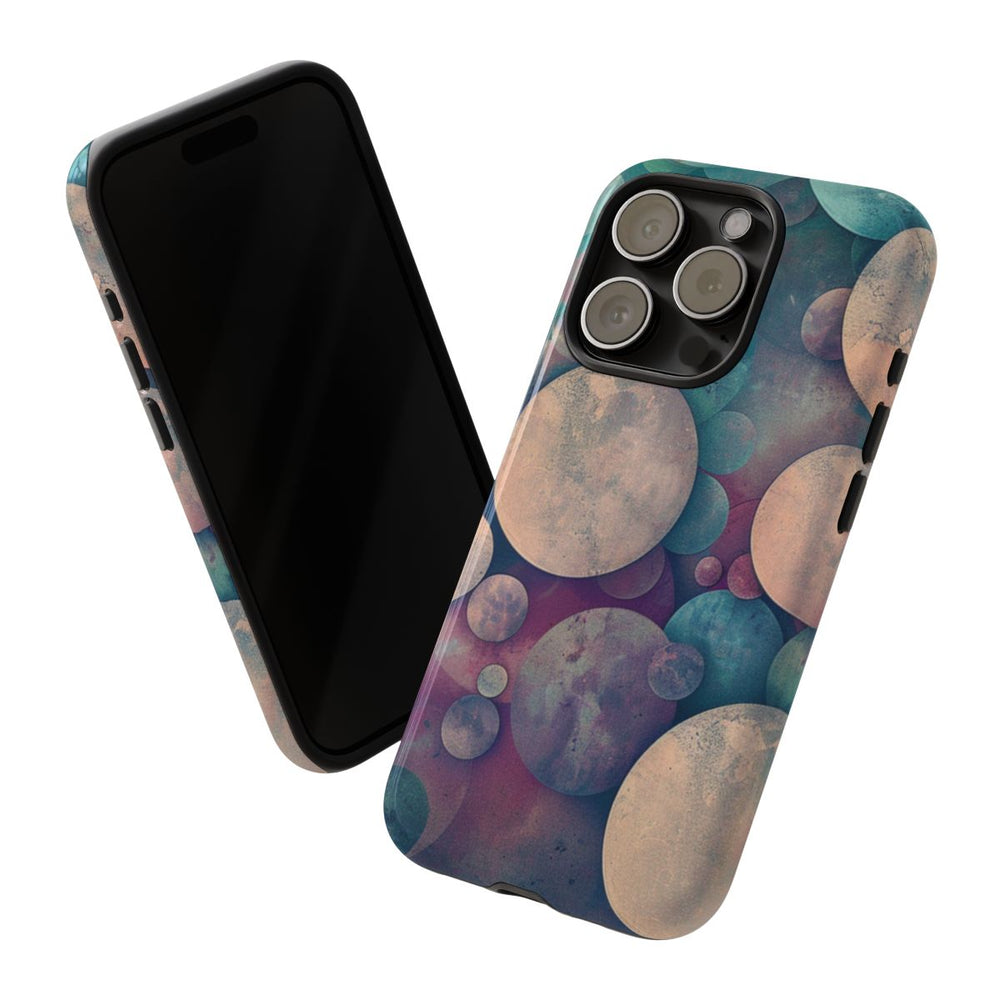 Dit telefoonhoesje heeft een abstract patroon van cirkels in verschillende groottes die speels over elkaar heen vallen. De cirkels hebben een schilderachtig effect met een dromerige mix van zachte blauwtinten, roze, paars en vergrijsd beige. De achtergrond sluit hier mooi op aan met vergelijkbare kleuren, wat zorgt voor een harmonieus en artistiek geheel. Het hoesje is glanzend afgewerkt, gemaakt van polycarbonaat en TPU, en biedt stevige bescherming dankzij de dubbele laag. Geschikt voor draadloos opladen.