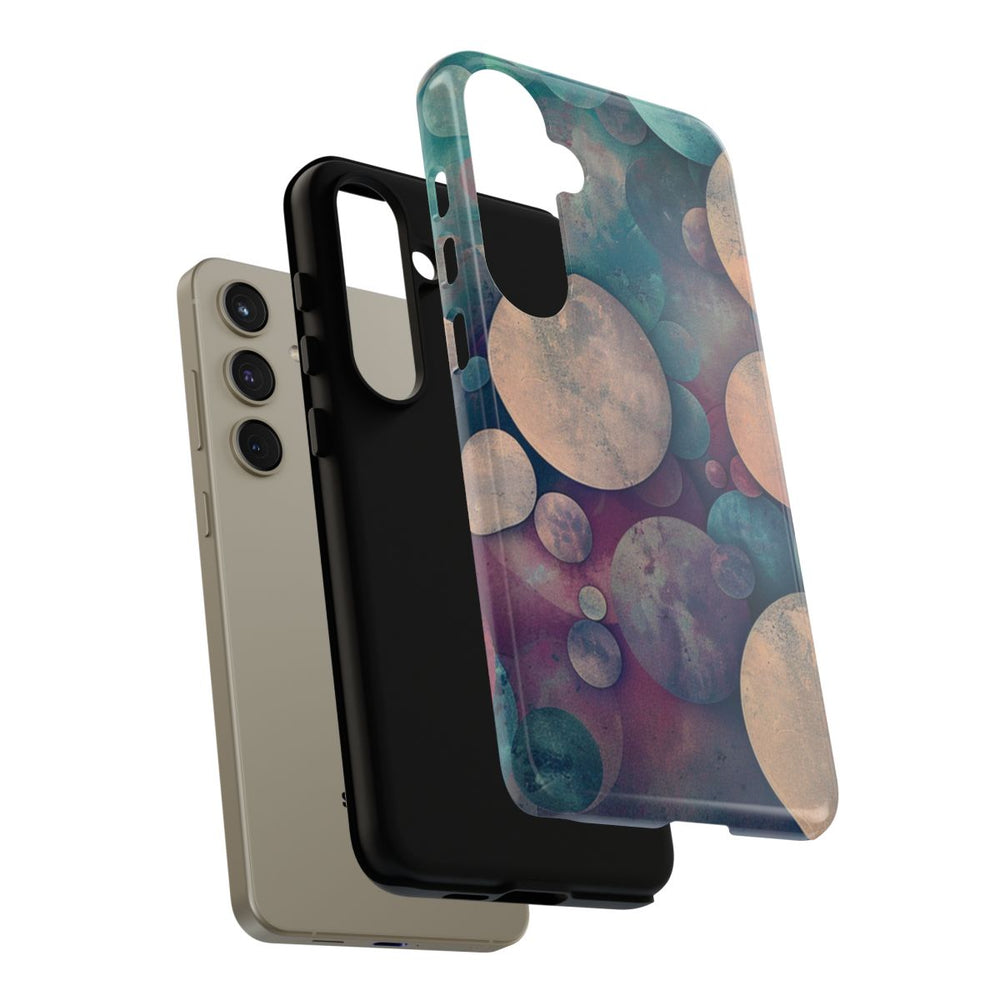 Dit telefoonhoesje heeft een abstract patroon van cirkels in verschillende groottes die speels over elkaar heen vallen. De cirkels hebben een schilderachtig effect met een dromerige mix van zachte blauwtinten, roze, paars en vergrijsd beige. De achtergrond sluit hier mooi op aan met vergelijkbare kleuren, wat zorgt voor een harmonieus en artistiek geheel. Het hoesje is glanzend afgewerkt, gemaakt van polycarbonaat en TPU, en biedt stevige bescherming dankzij de dubbele laag. Geschikt voor draadloos opladen.