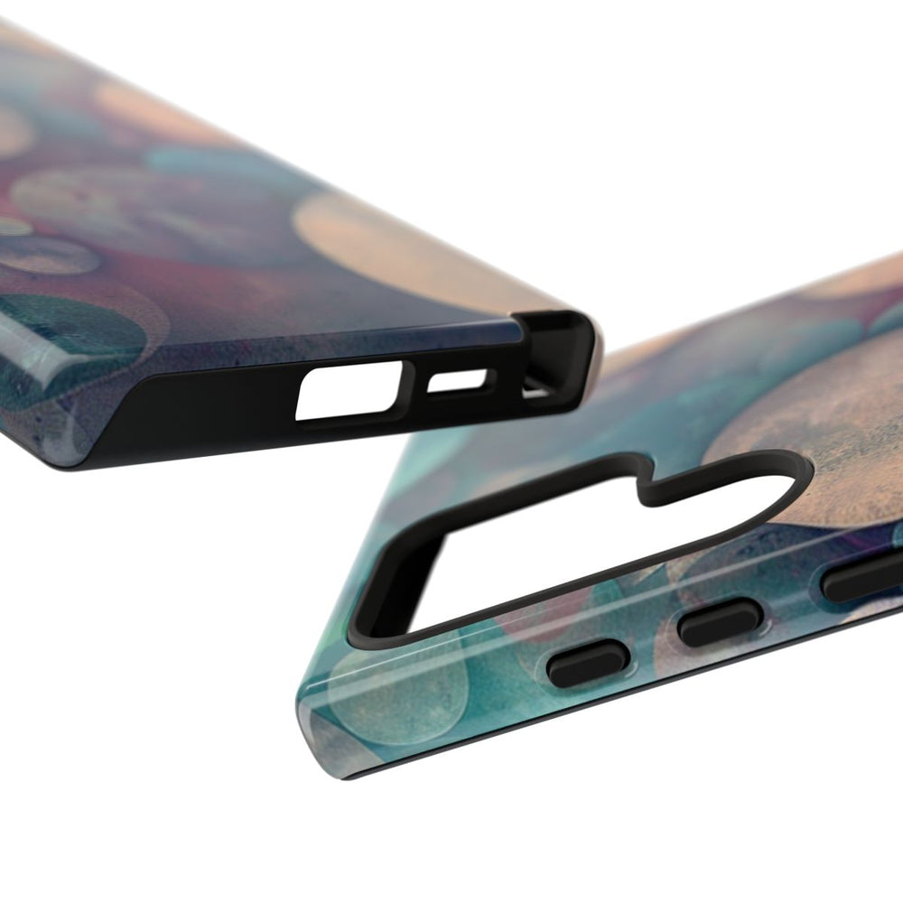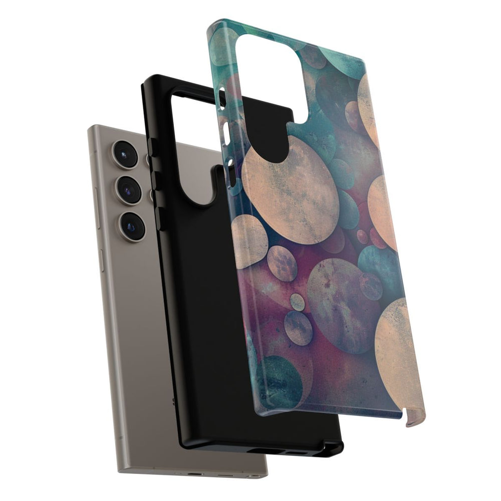 Dit telefoonhoesje heeft een abstract patroon van cirkels in verschillende groottes die speels over elkaar heen vallen. De cirkels hebben een schilderachtig effect met een dromerige mix van zachte blauwtinten, roze, paars en vergrijsd beige. De achtergrond sluit hier mooi op aan met vergelijkbare kleuren, wat zorgt voor een harmonieus en artistiek geheel. Het hoesje is glanzend afgewerkt, gemaakt van polycarbonaat en TPU, en biedt stevige bescherming dankzij de dubbele laag. Geschikt voor draadloos opladen.