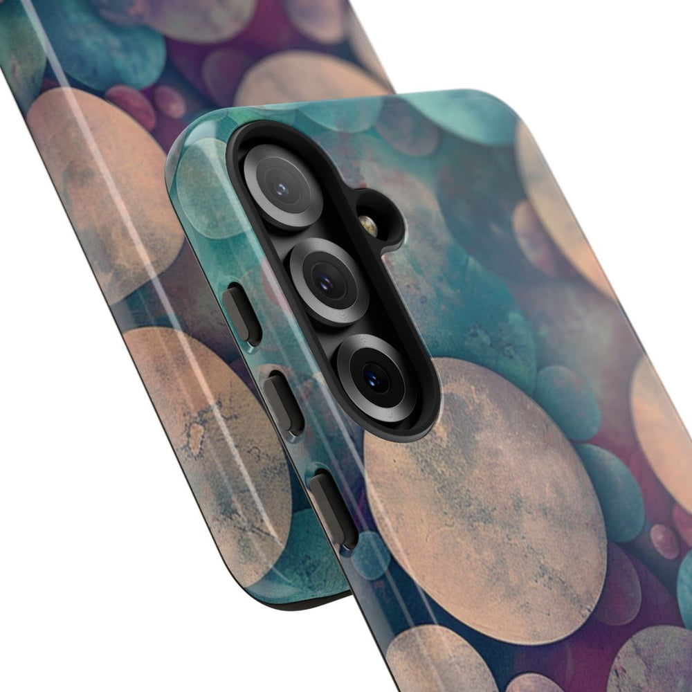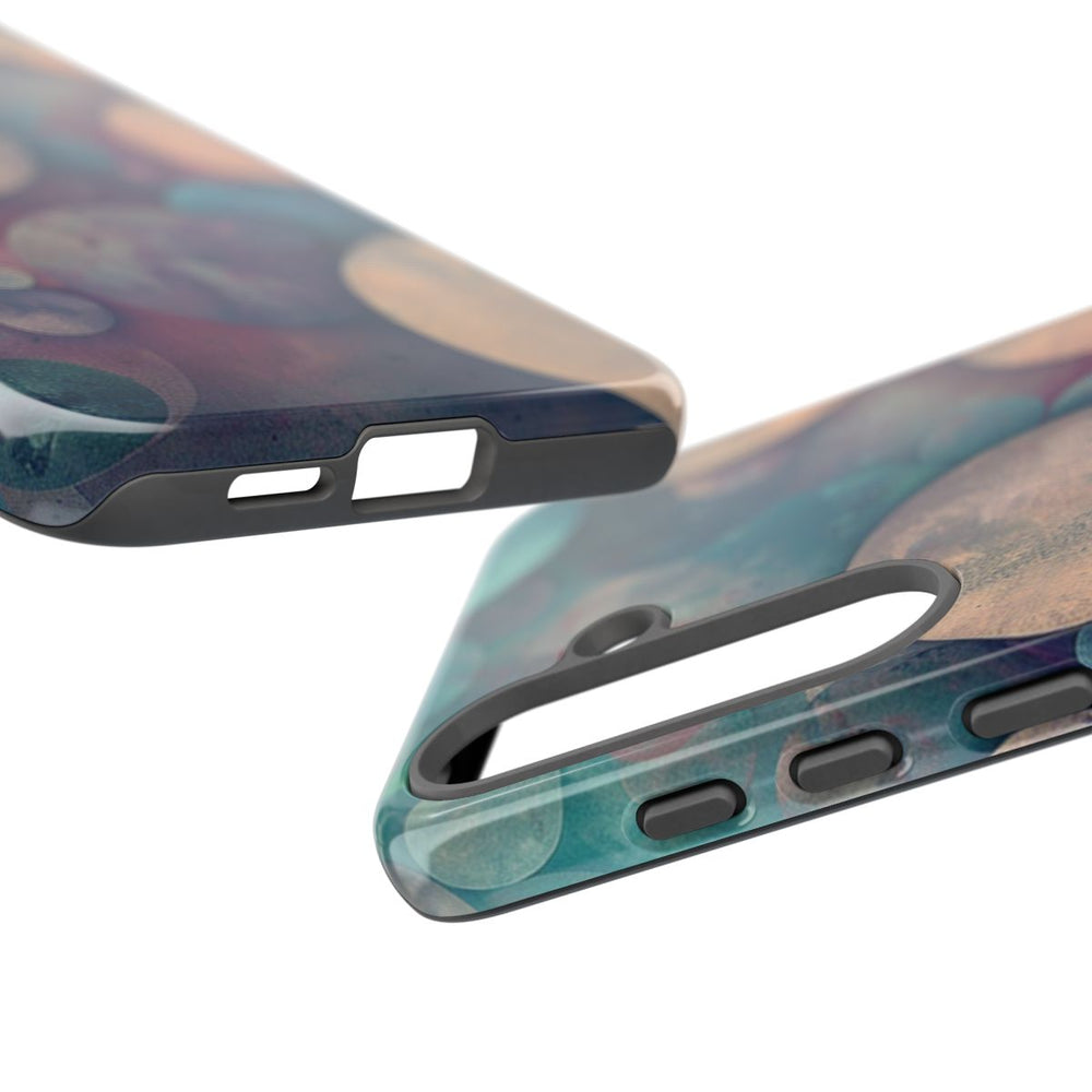 Dit telefoonhoesje heeft een abstract patroon van cirkels in verschillende groottes die speels over elkaar heen vallen. De cirkels hebben een schilderachtig effect met een dromerige mix van zachte blauwtinten, roze, paars en vergrijsd beige. De achtergrond sluit hier mooi op aan met vergelijkbare kleuren, wat zorgt voor een harmonieus en artistiek geheel. Het hoesje is glanzend afgewerkt, gemaakt van polycarbonaat en TPU, en biedt stevige bescherming dankzij de dubbele laag. Geschikt voor draadloos opladen.