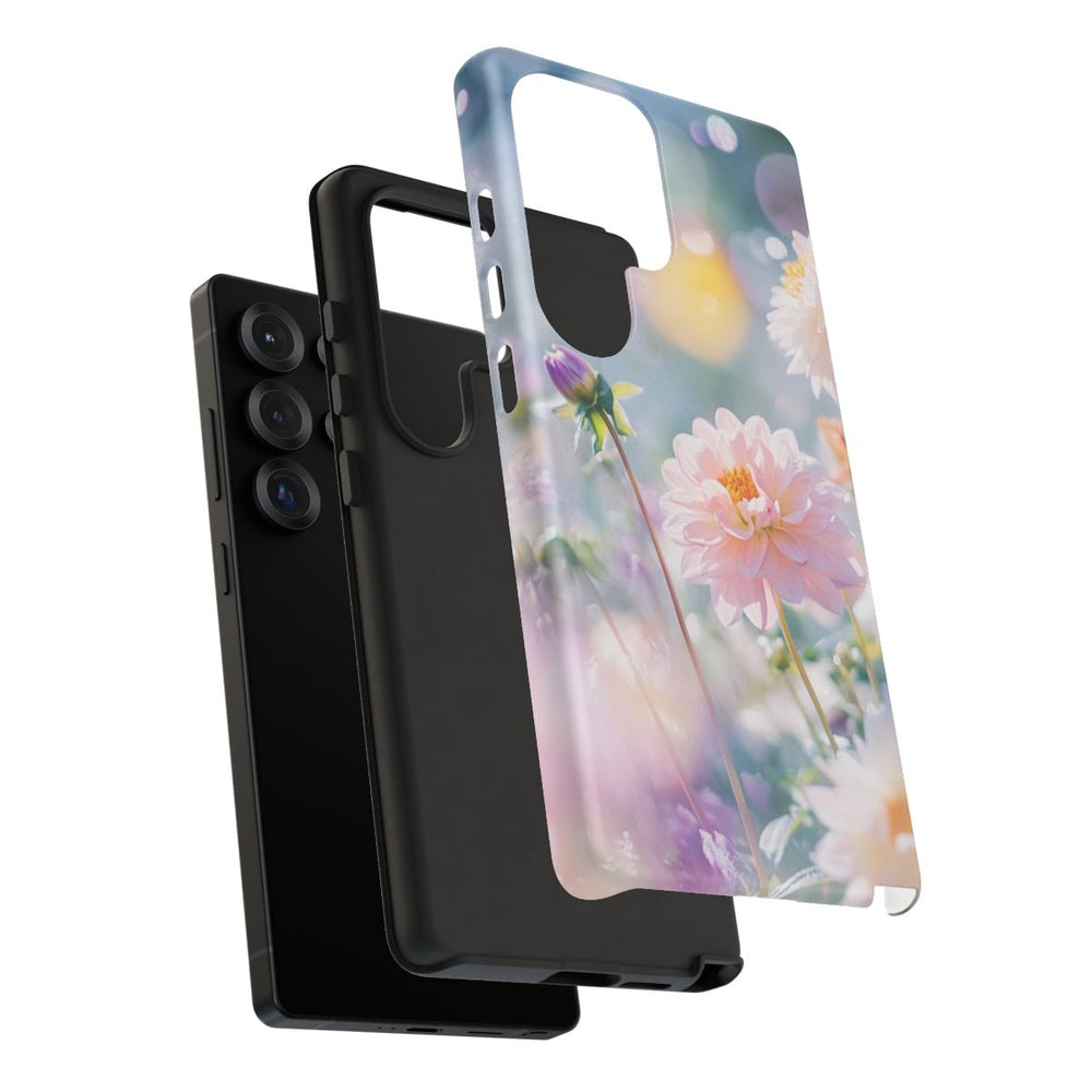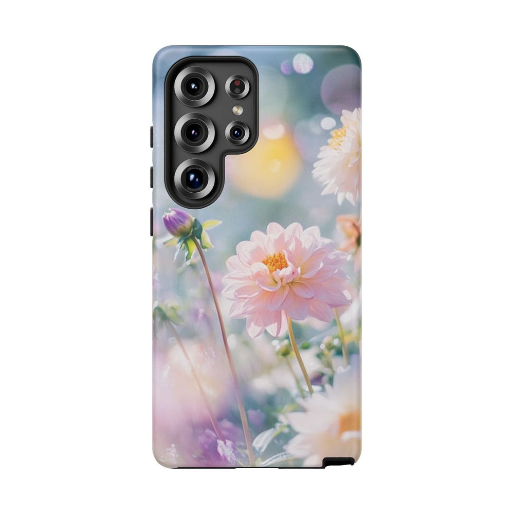 Dit hoesje is versierd met een prachtige groep dahlia's in zachte focus, met verfijnde roze en witte bloemen. De achtergrond heeft een subtiel bokeh-effect, wat zorgt voor een dromerige uitstraling. De levendige kleuren en het natuurlijke licht brengen de schoonheid van de bloemen extra naar voren. Dit matte, stevige hoesje is ontworpen voor optimale bescherming en duurzaamheid, en geeft je toestel een stijlvolle uitstraling. Het hoesje ondersteunt draadloos opladen en is gemaakt van hoogwaardige materialen voor langdurig gebruik.