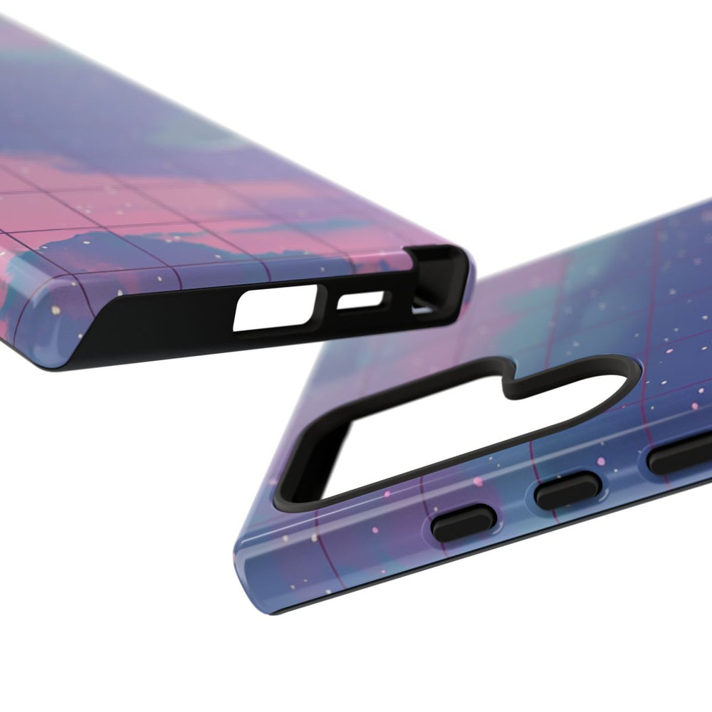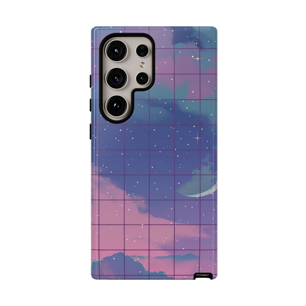 Dit hoesje heeft een herhaald patroon van een nachtelijke hemel met een sierlijke halve maan en verspreide wolken. De achtergrond verloopt van diepblauw naar zachte roze en paarse tinten, wat zorgt voor een rustgevende en dromerige uitstraling. Kleine witte sterren en glinsterende accenten versterken het hemelse thema. Een subtiel raster geeft het ontwerp een moderne twist. Het ontwerp is gedrukt op een glanzend en stevig hoesje van polycarbonaat en TPU, dat optimale bescherming biedt en geschikt is voor draadloos opladen.