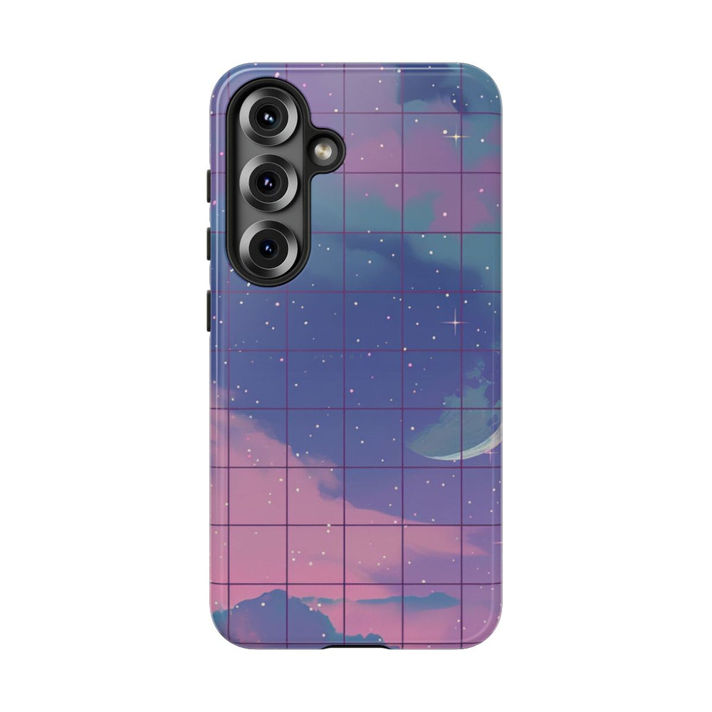 Dit hoesje heeft een herhaald patroon van een nachtelijke hemel met een sierlijke halve maan en verspreide wolken. De achtergrond verloopt van diepblauw naar zachte roze en paarse tinten, wat zorgt voor een rustgevende en dromerige uitstraling. Kleine witte sterren en glinsterende accenten versterken het hemelse thema. Een subtiel raster geeft het ontwerp een moderne twist. Het ontwerp is gedrukt op een glanzend en stevig hoesje van polycarbonaat en TPU, dat optimale bescherming biedt en geschikt is voor draadloos opladen.