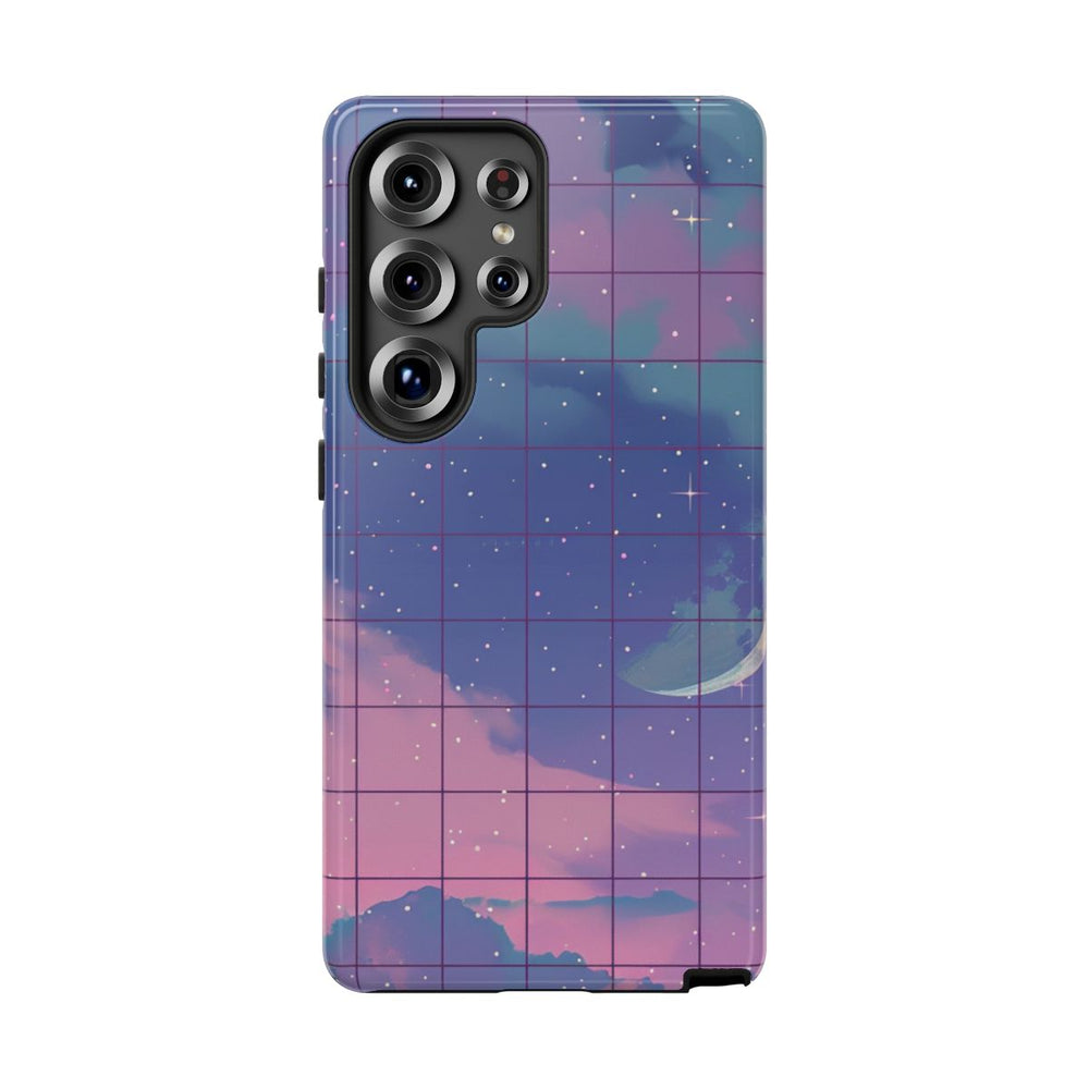 Dit hoesje heeft een herhaald patroon van een nachtelijke hemel met een sierlijke halve maan en verspreide wolken. De achtergrond verloopt van diepblauw naar zachte roze en paarse tinten, wat zorgt voor een rustgevende en dromerige uitstraling. Kleine witte sterren en glinsterende accenten versterken het hemelse thema. Een subtiel raster geeft het ontwerp een moderne twist. Het ontwerp is gedrukt op een glanzend en stevig hoesje van polycarbonaat en TPU, dat optimale bescherming biedt en geschikt is voor draadloos opladen.