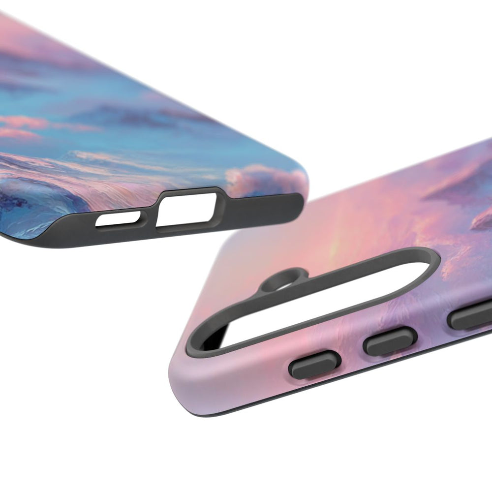 Dit hoesje toont een rustgevend landschap met bergtoppen in zachte roze en blauwe tinten. De bergen worden omringd door luchtige wolken, wat zorgt voor een dromerige en vredige sfeer. Op de achtergrond is een lichtpaarse lucht te zien met een subtiele gloed, die doet denken aan zonsopkomst of zonsondergang. De afbeelding is voorzien van getextureerde penseelstreken, waardoor de besneeuwde bergen en wolken extra diepte en detail krijgen. Deze afbeelding is gedrukt op een mat, stevig hoesje van duurzame materialen en ondersteunt draadloos opladen.