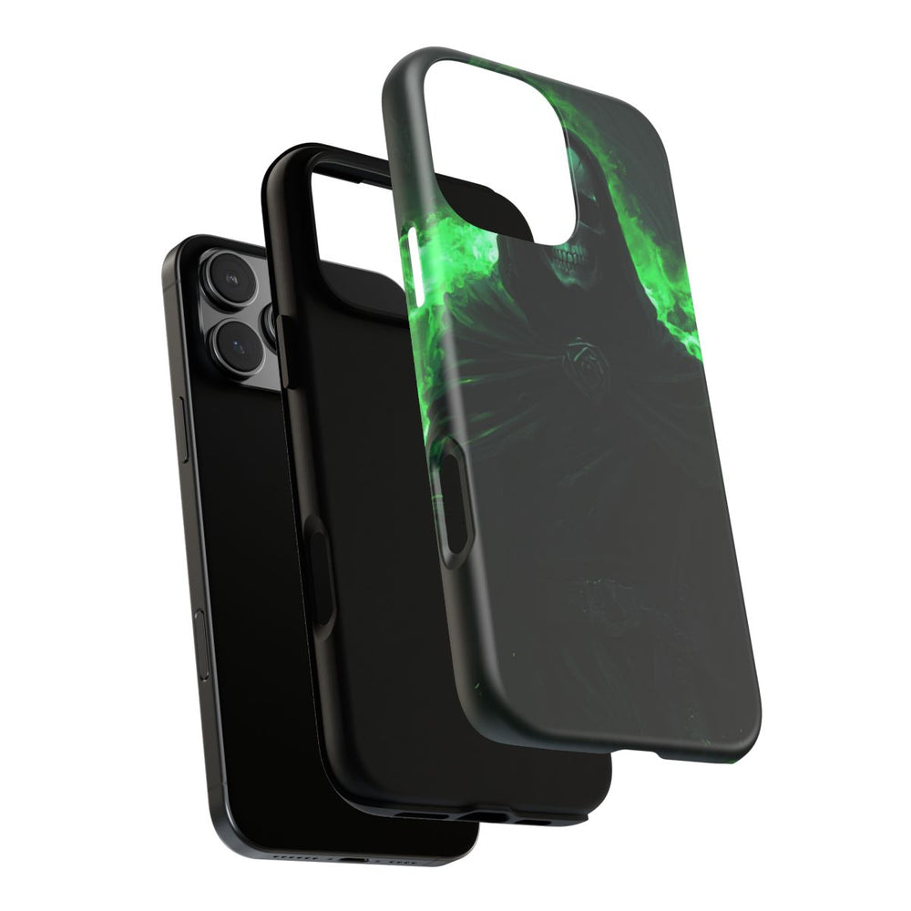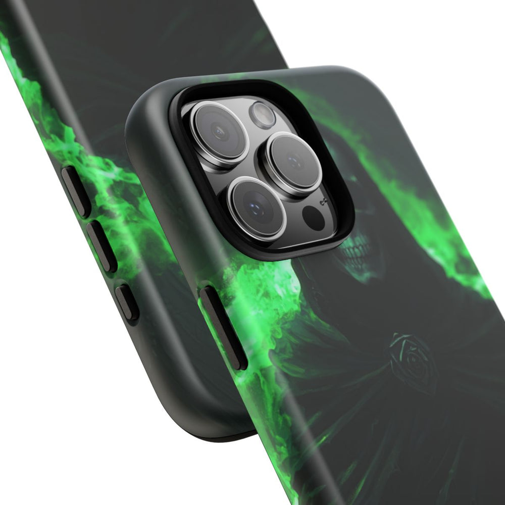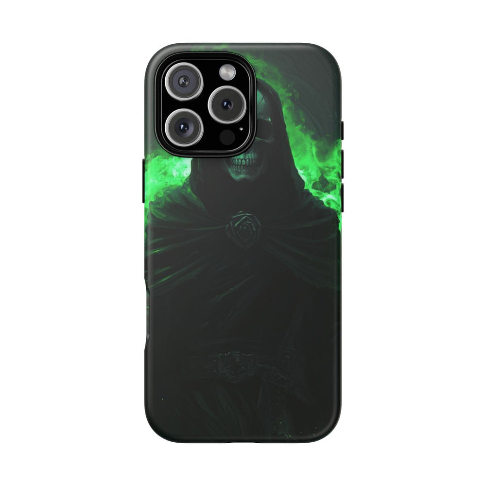 Dit hoesje toont een gedetailleerd skelet in een donkere, gehulde mantel. De schedel valt op door holle oogkassen en een grijns. Het skelet staat in een schimmige, stenen ruimte met bogen, omgeven door kolkende groene magische vlammen die uit zijn botten handen opstijgen. Het hoesje bestaat uit twee lagen met een stevige polycarbonaat buitenkant en een TPU-binnenzijde voor extra bescherming. Ondersteunt draadloos opladen.