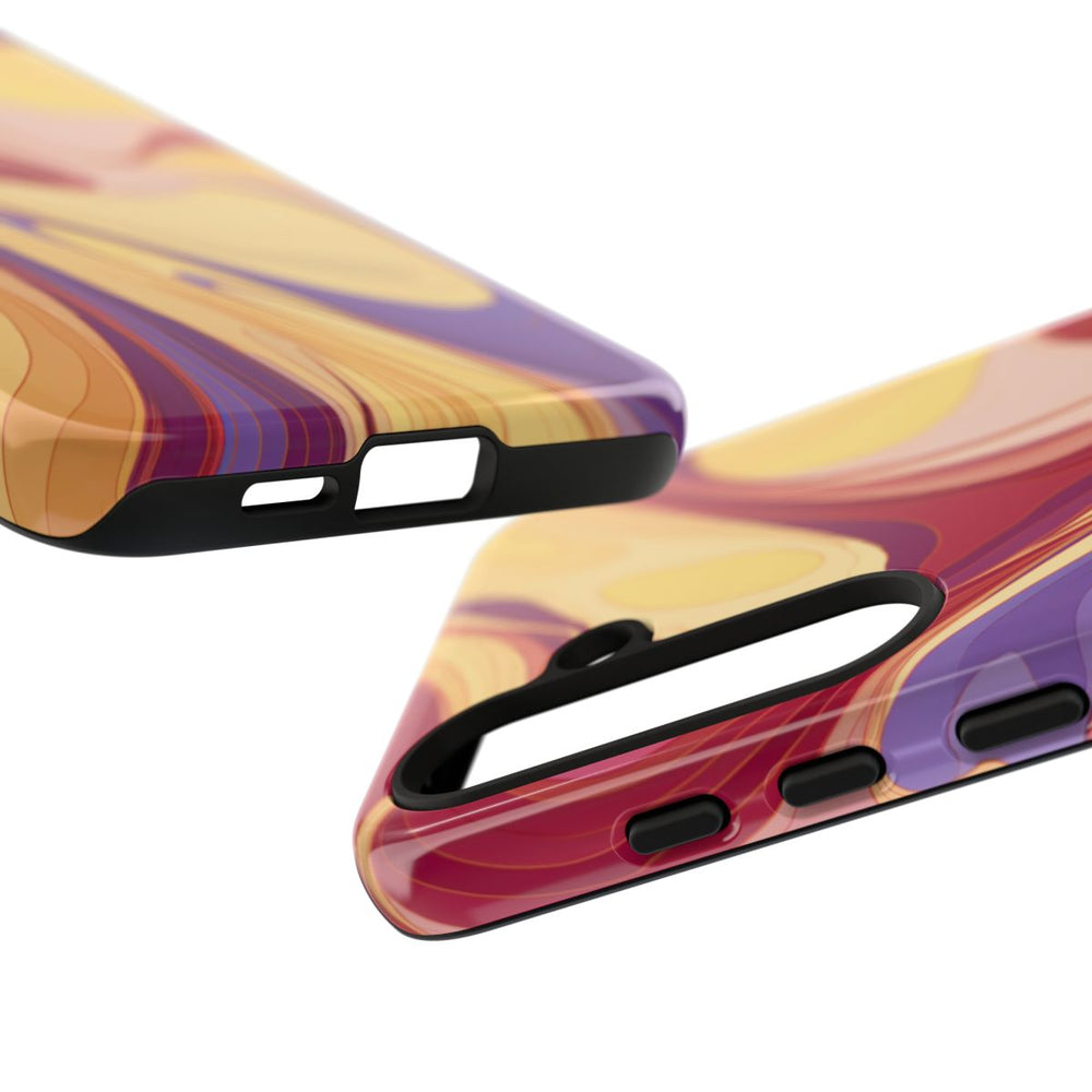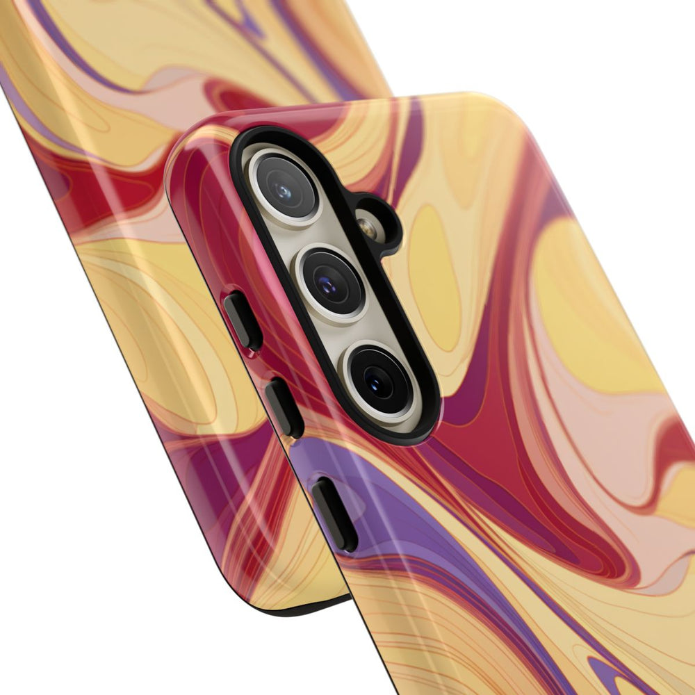 Dit hoesje heeft een abstract patroon van draaiende vormen met vloeiende lijnen en zachte rondingen. De kleuren lichtgeel, bourgondisch rood en lila lopen mooi in elkaar over en zorgen voor een levendig en opvallend effect. Het ontwerp oogt organisch en speels, met verschillende kleurvlakken die over elkaar heen bewegen. Het hoesje is glanzend afgewerkt en bestaat uit twee lagen: een stevige polycarbonaat buitenkant en een TPU binnenzijde. Zo biedt het optimale bescherming en is het geschikt voor draadloos opladen.