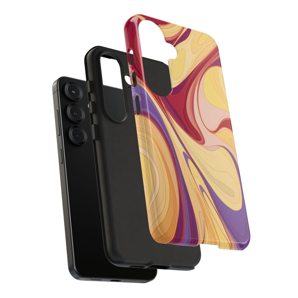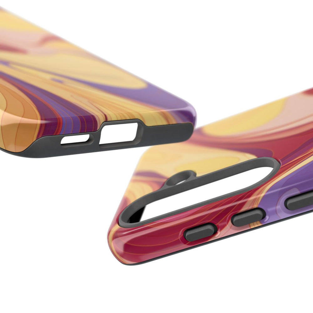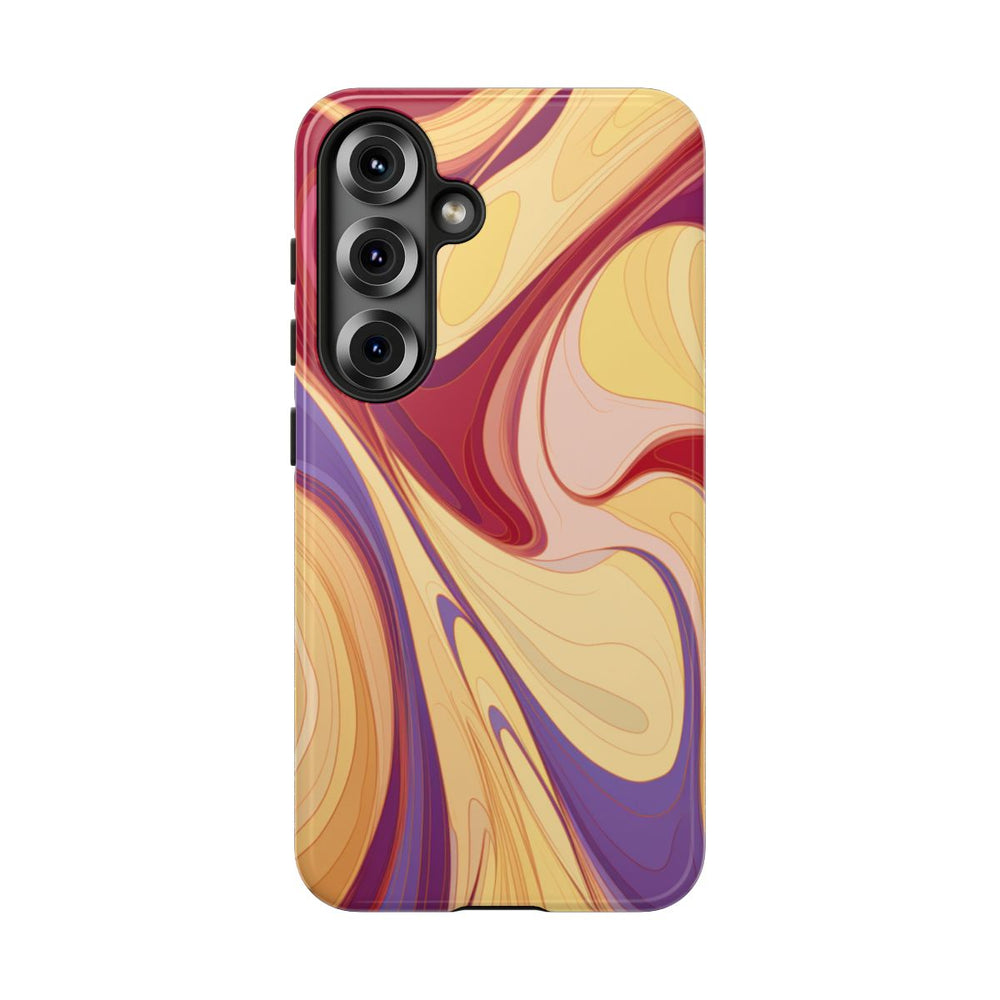 Dit hoesje heeft een abstract patroon van draaiende vormen met vloeiende lijnen en zachte rondingen. De kleuren lichtgeel, bourgondisch rood en lila lopen mooi in elkaar over en zorgen voor een levendig en opvallend effect. Het ontwerp oogt organisch en speels, met verschillende kleurvlakken die over elkaar heen bewegen. Het hoesje is glanzend afgewerkt en bestaat uit twee lagen: een stevige polycarbonaat buitenkant en een TPU binnenzijde. Zo biedt het optimale bescherming en is het geschikt voor draadloos opladen.