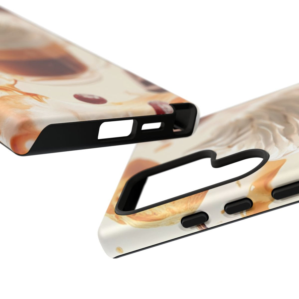 Dit hoesje heeft een speels ontwerp met koffie en gebak die lijken te zweven op een lichtbeige achtergrond. Je ziet onder andere een gelaagde koffiedrank met slagroom, stukjes chocolade, croissants, koffiebonen en sierlijke krullen van room en karamel. Het geheel straalt een levendige en smakelijke sfeer uit met warme tinten. Het hoesje bestaat uit twee lagen van polycarbonaat en TPU met een matte afwerking en is geschikt voor draadloos opladen.