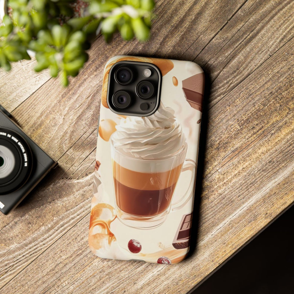 Dit telefoonhoesje is bedrukt met een levendige illustratie van koffie en zoete lekkernijen die speels zweven tegen een lichtbeige achtergrond. Op de afbeelding zie je onder andere een gelaagde koffiedrank met slagroom, stukjes brood, chocoladestukjes, toefjes slagroom, koffiebonen en spatten van romige vloeistof. Het ontwerp straalt energie uit en is aangebracht op een stevig, mat hoesje met dubbele laag. Het hoesje ondersteunt draadloos opladen en is bestand tegen verschillende weersomstandigheden.