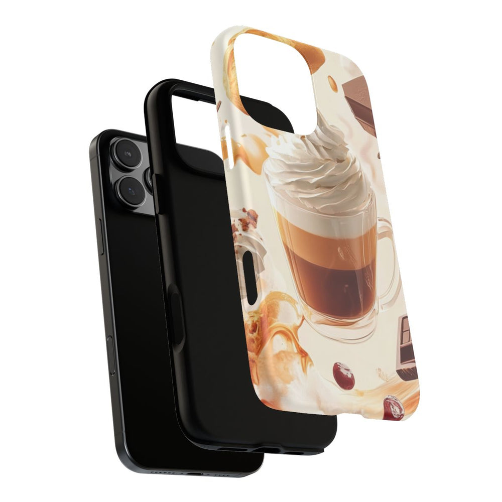 Dit hoesje heeft een levendig ontwerp met een glas koffie met laagjes room, omringd door zwevende dessertdetails zoals toefjes slagroom, stukjes chocolade, broodjes en koffiebonen. De zachte beige achtergrond laat de warme tinten van de koffie en het gebak extra goed uitkomen. Het hoesje is dubbel gelaagd met een stevige polycarbonaat buitenkant en een TPU binnenzijde. Ondersteunt draadloos opladen en is bestand tegen verschillende weersomstandigheden.