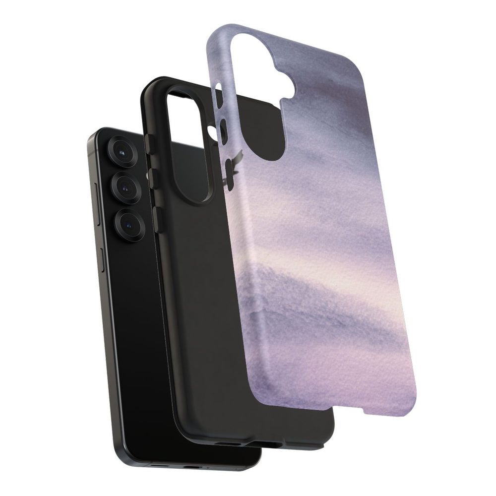 Dit ontwerp toont een eenzame vogel die vliegt tegen een getextureerde lucht in paarse en grijze tinten. De lucht heeft een aquareleffect met zachte kleurverlopen en gelaagde wolken, wat zorgt voor een rustige en minimalistische uitstraling. De afbeelding is bedrukt op een mat hoesje van polycarbonaat met een TPU-voering en biedt dubbele bescherming. Het hoesje ondersteunt draadloos opladen en is bestand tegen weersinvloeden, waardoor de optische kwaliteit langdurig behouden blijft.